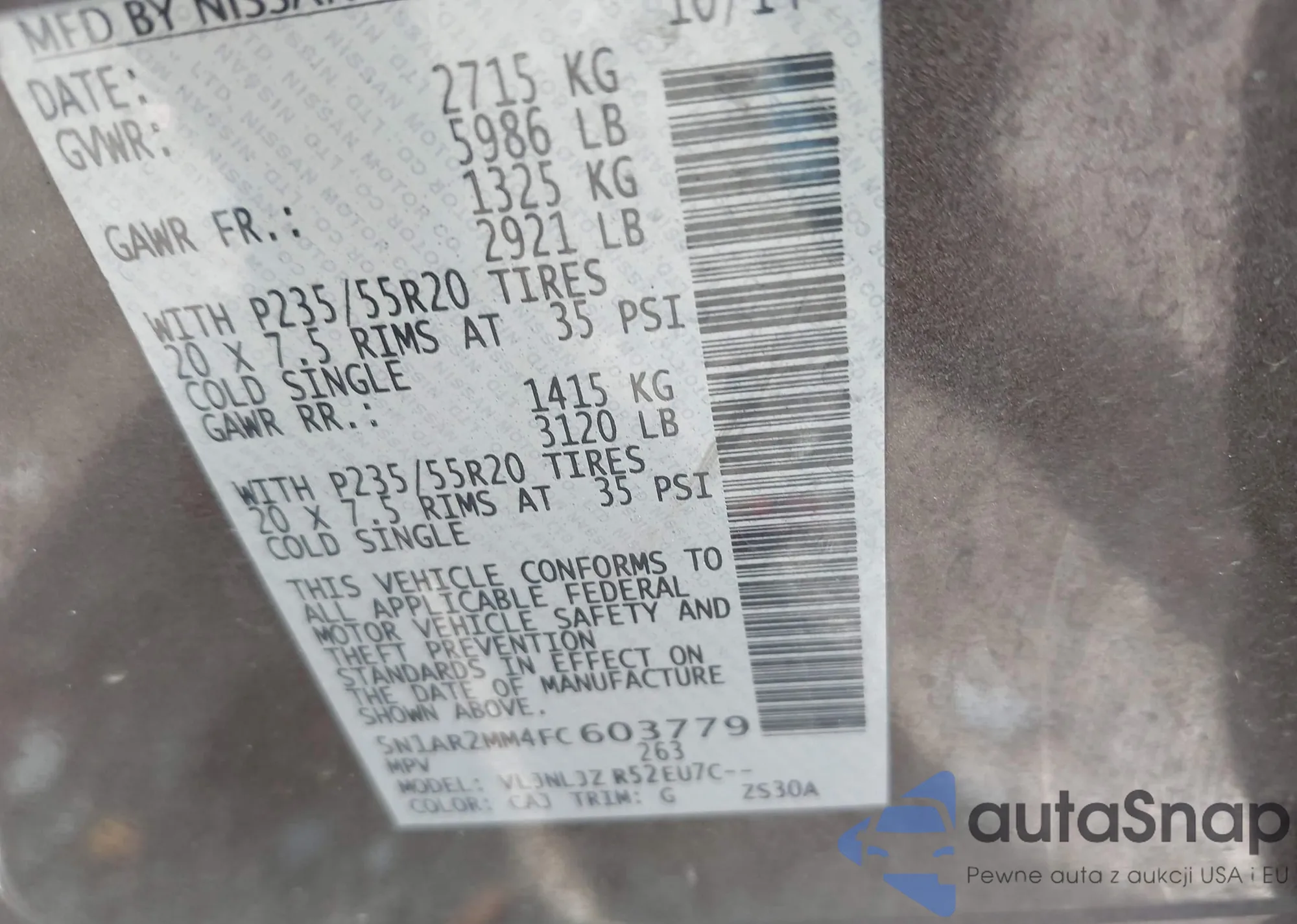 LOT: 42731531 VIN: 5N1AR2MM4FC603779