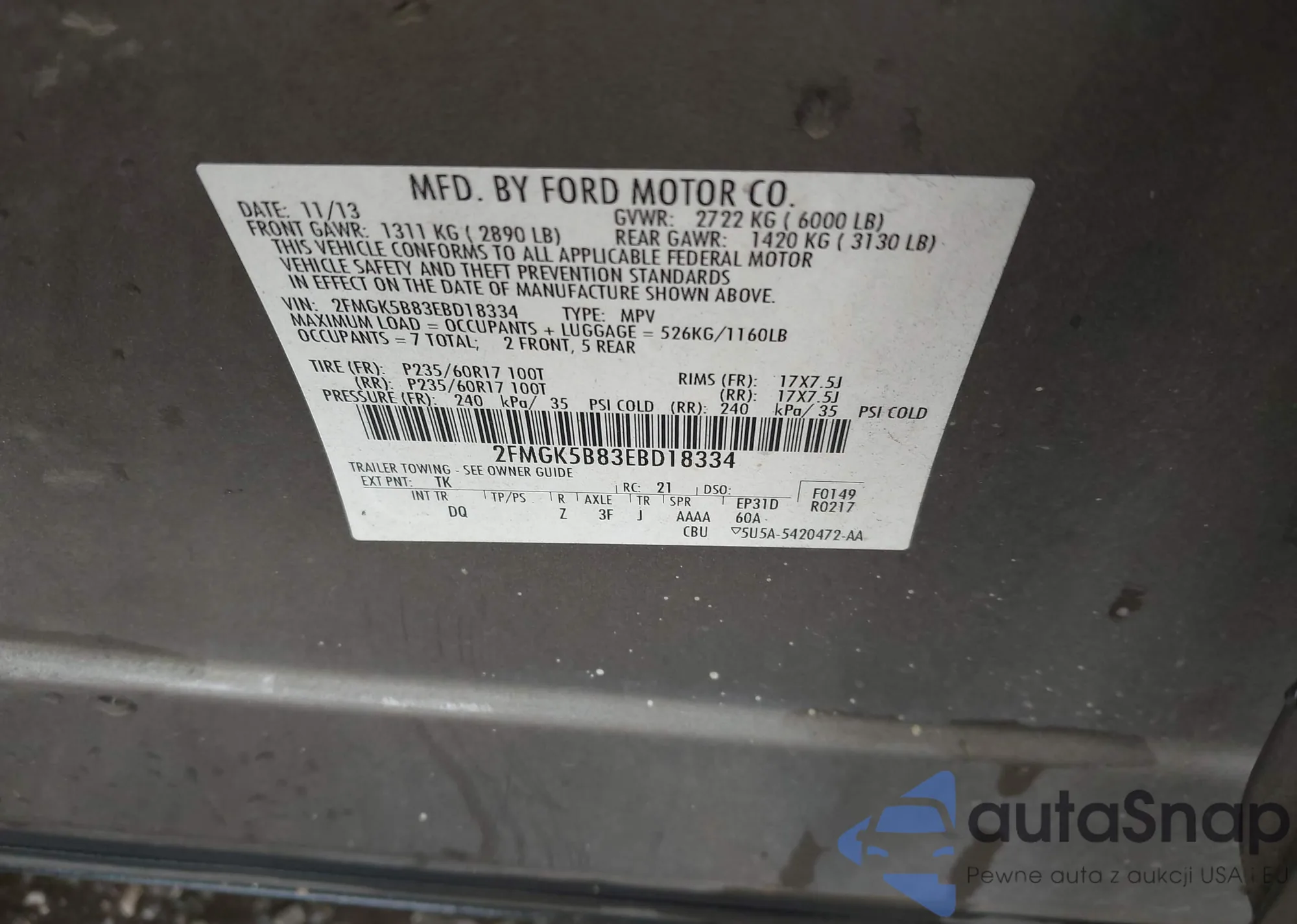 LOT: 42721574 VIN: 1FM5K8F8XDGB92029