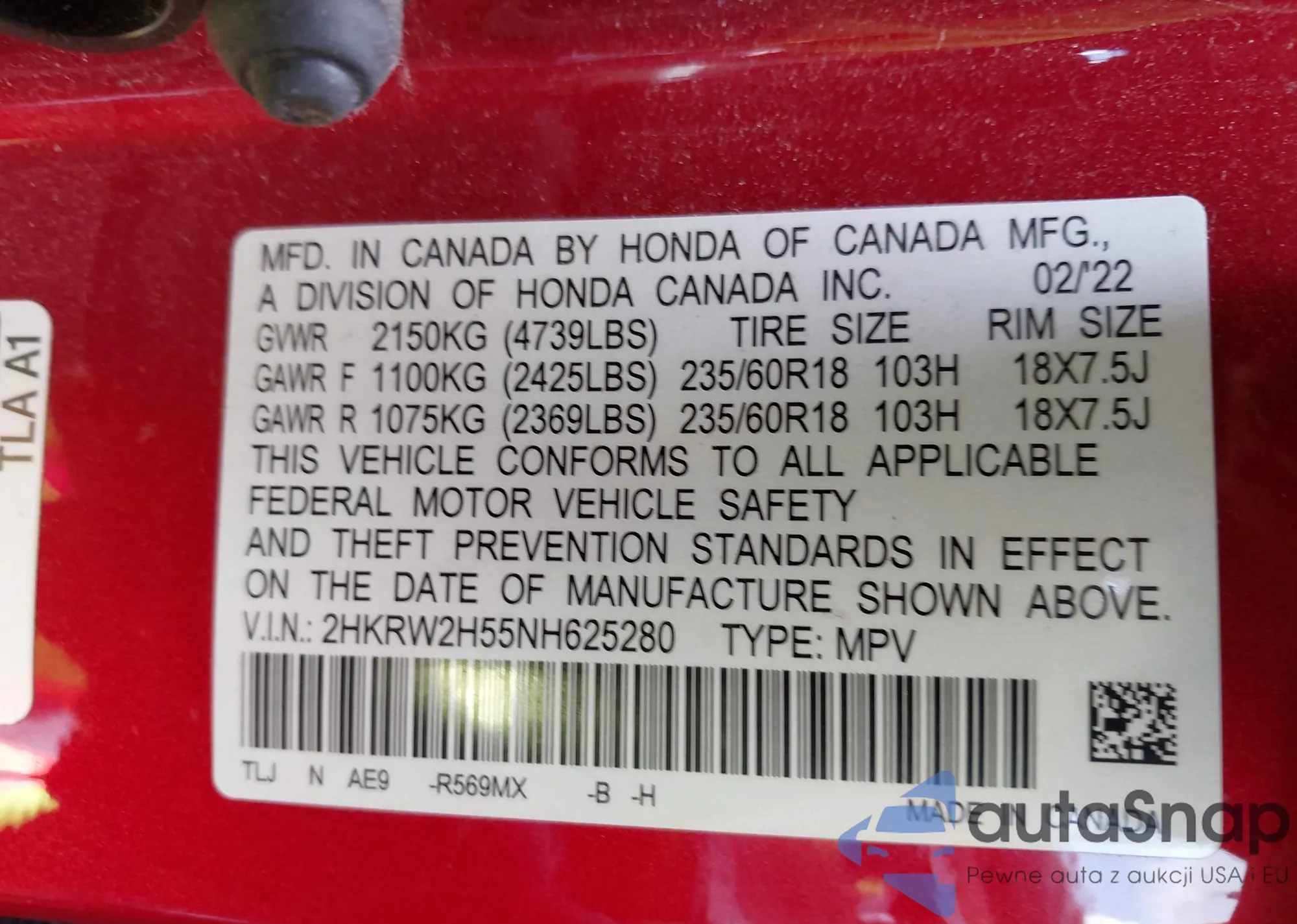 • VIN 2HKRW2H55NH625280