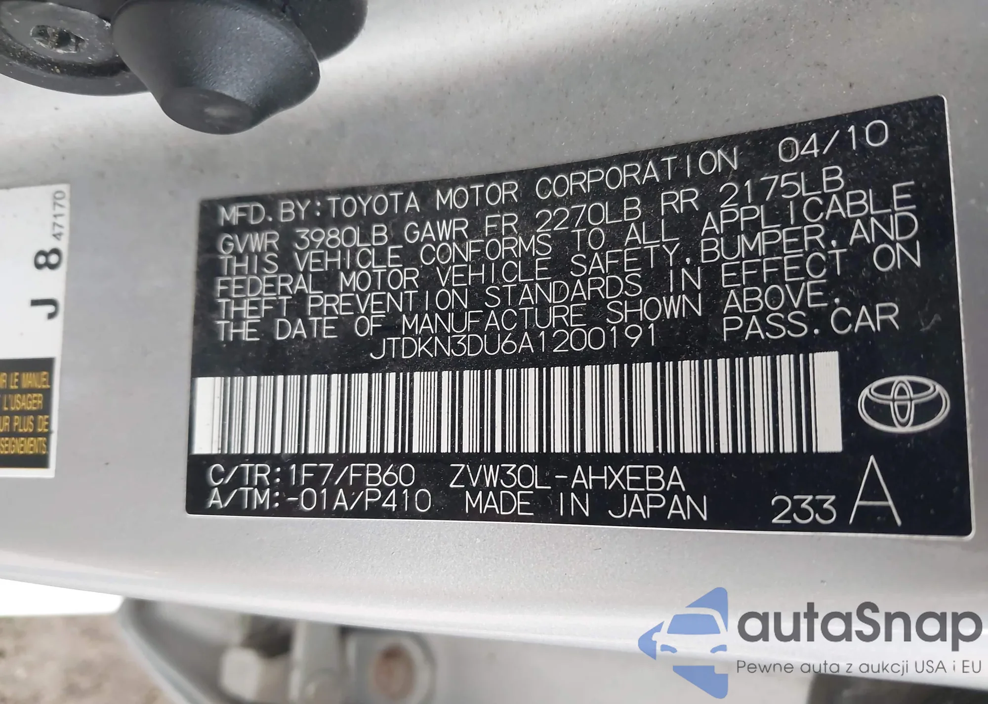 LOT: 42376774 VIN: JTDKN3DU6A1200191