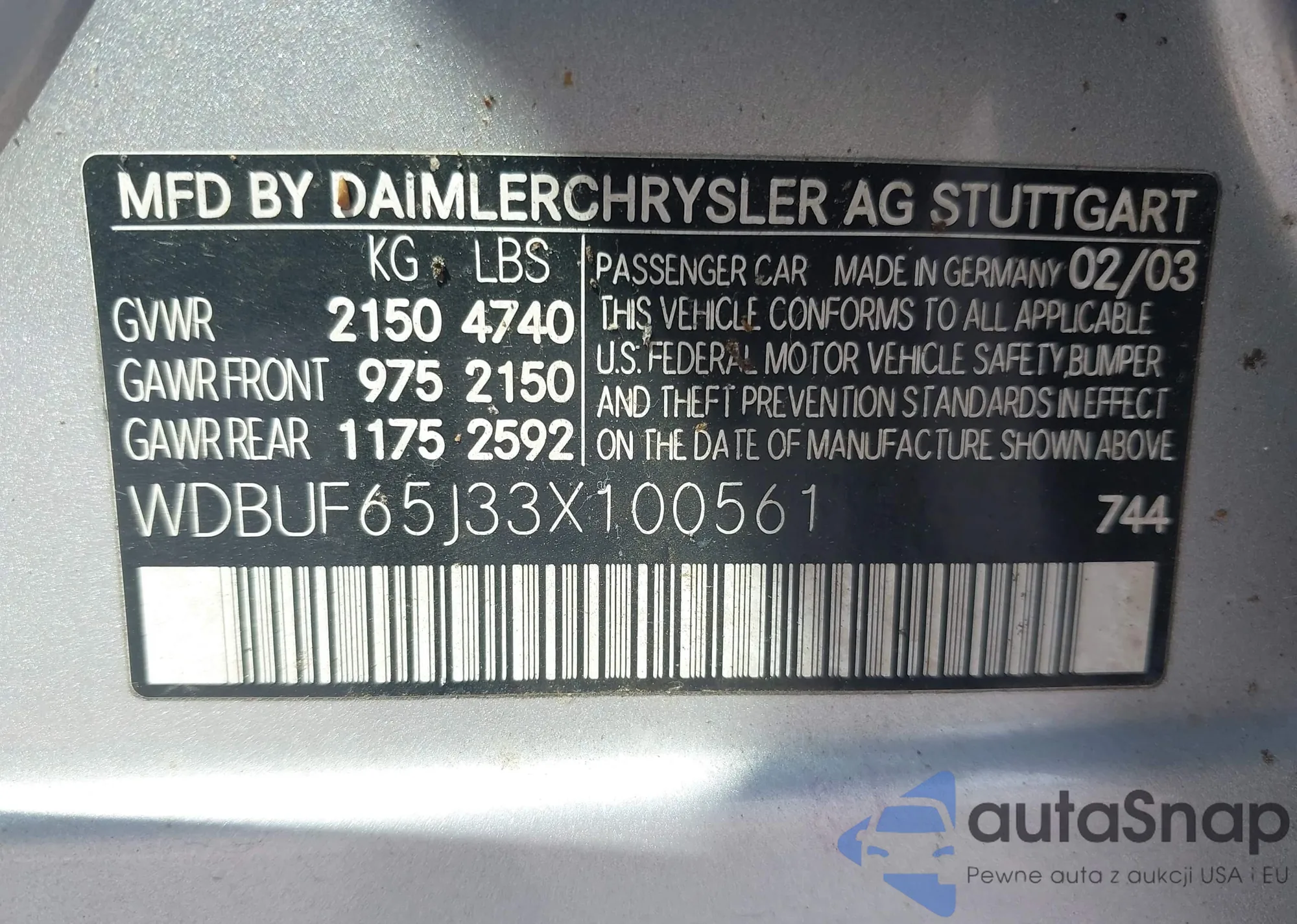 LOT: 42800069 VIN: WDBUF65J33X100561