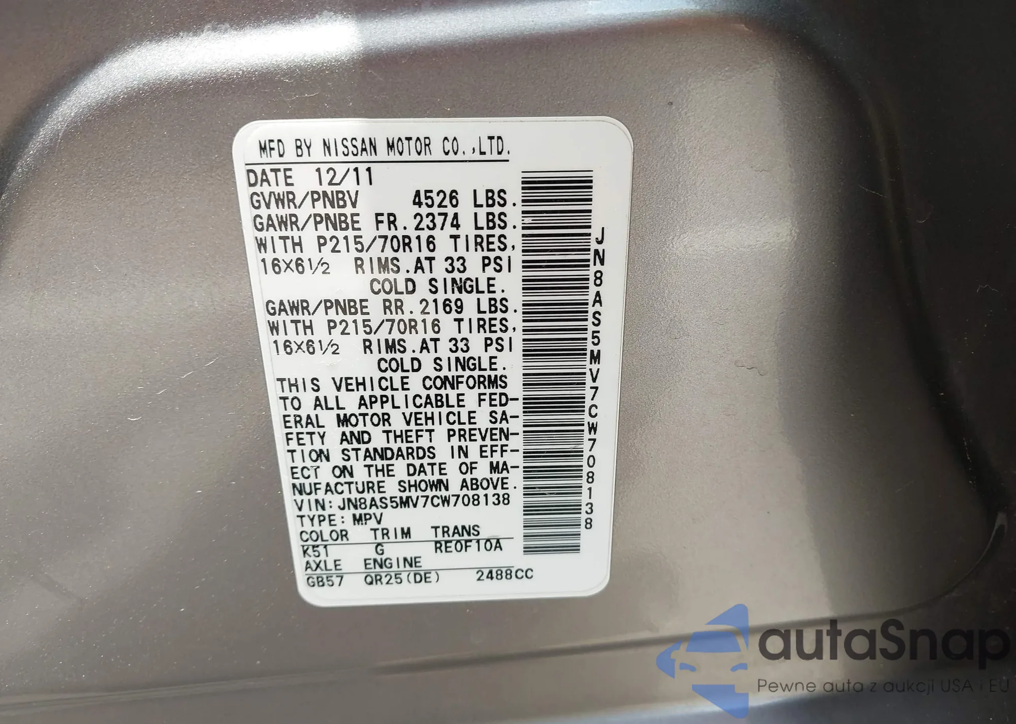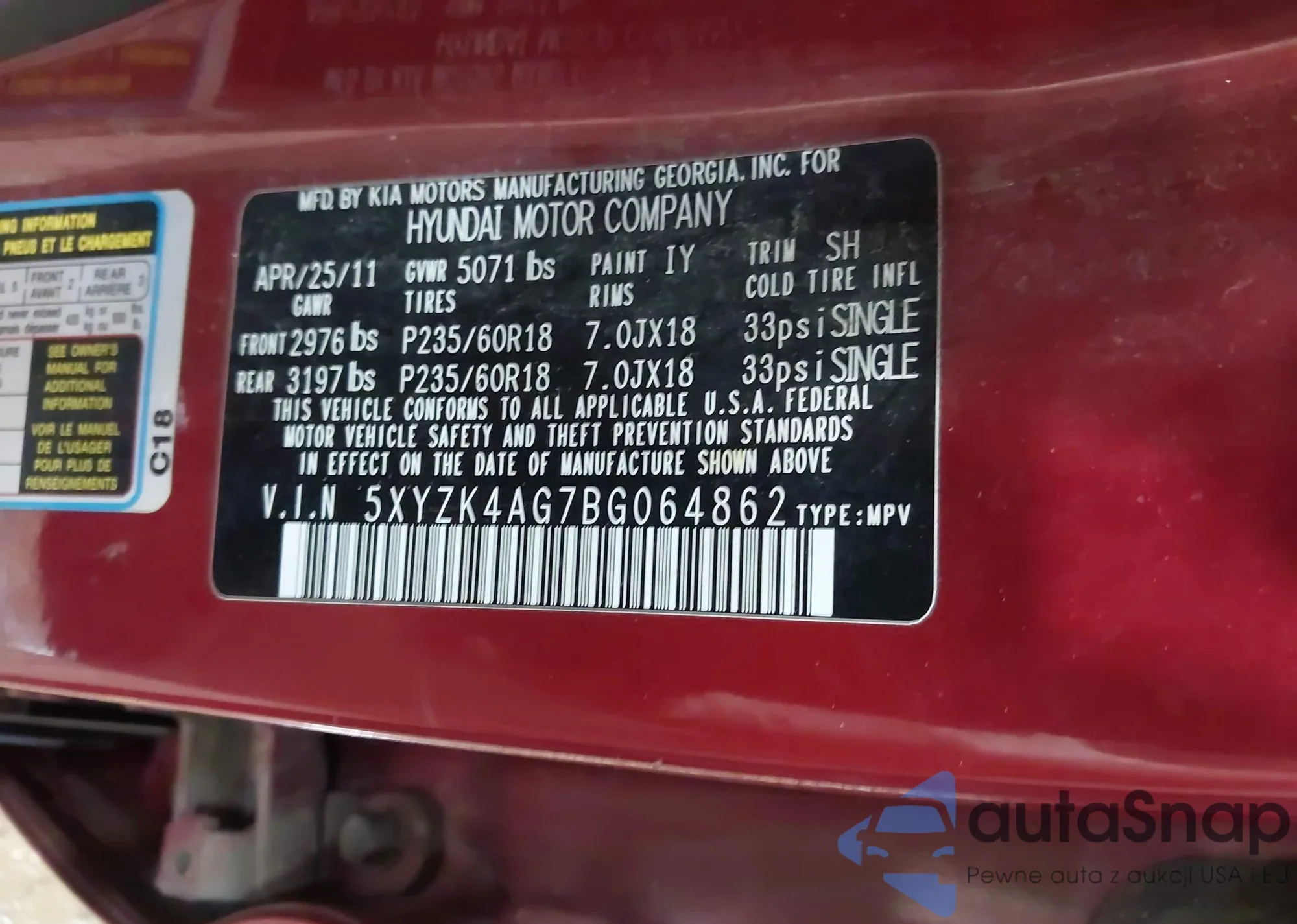 LOT: 42092658 VIN: 5XYZK4AG7BG064862