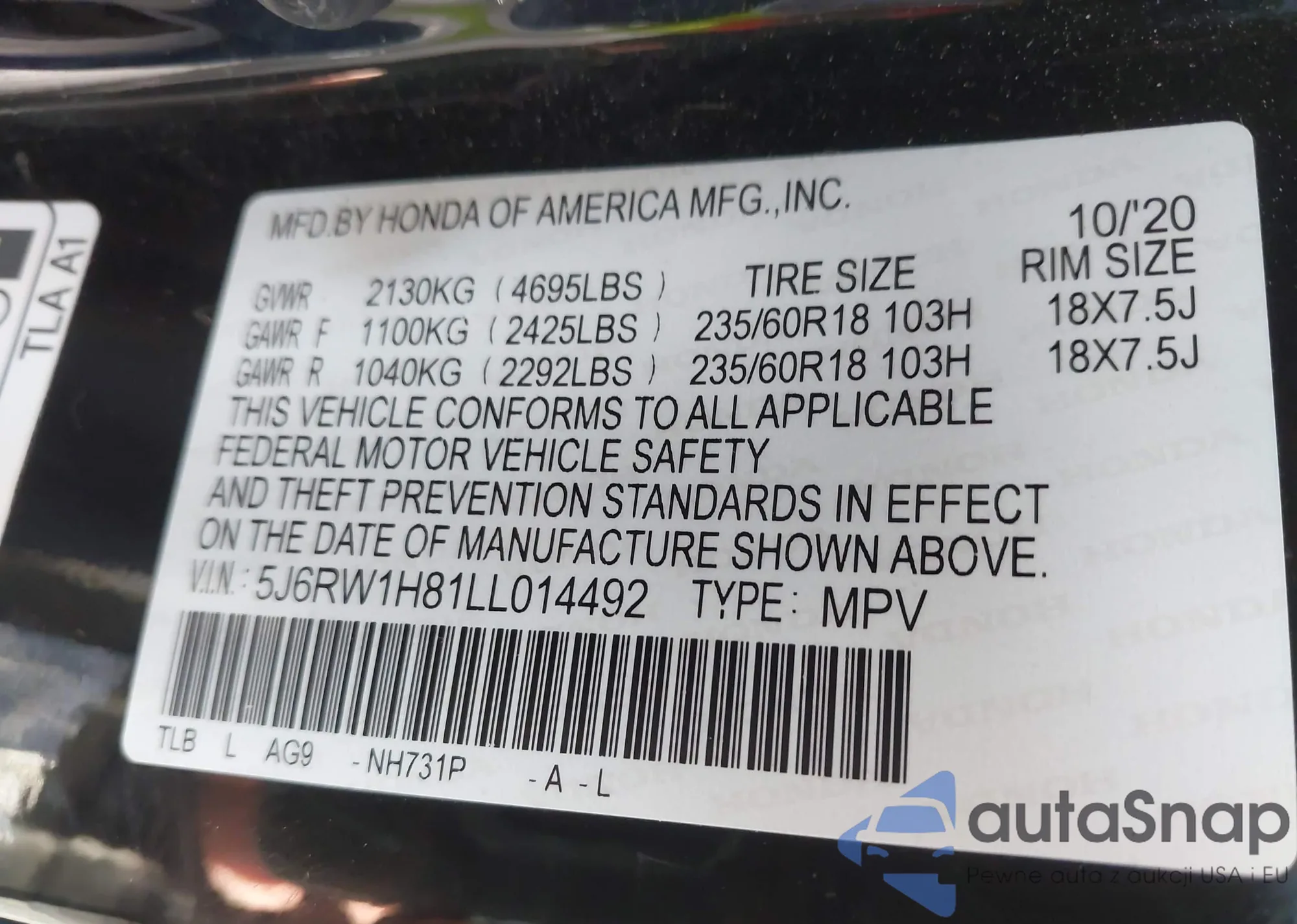 • VIN 5J6RW1H81LL014492