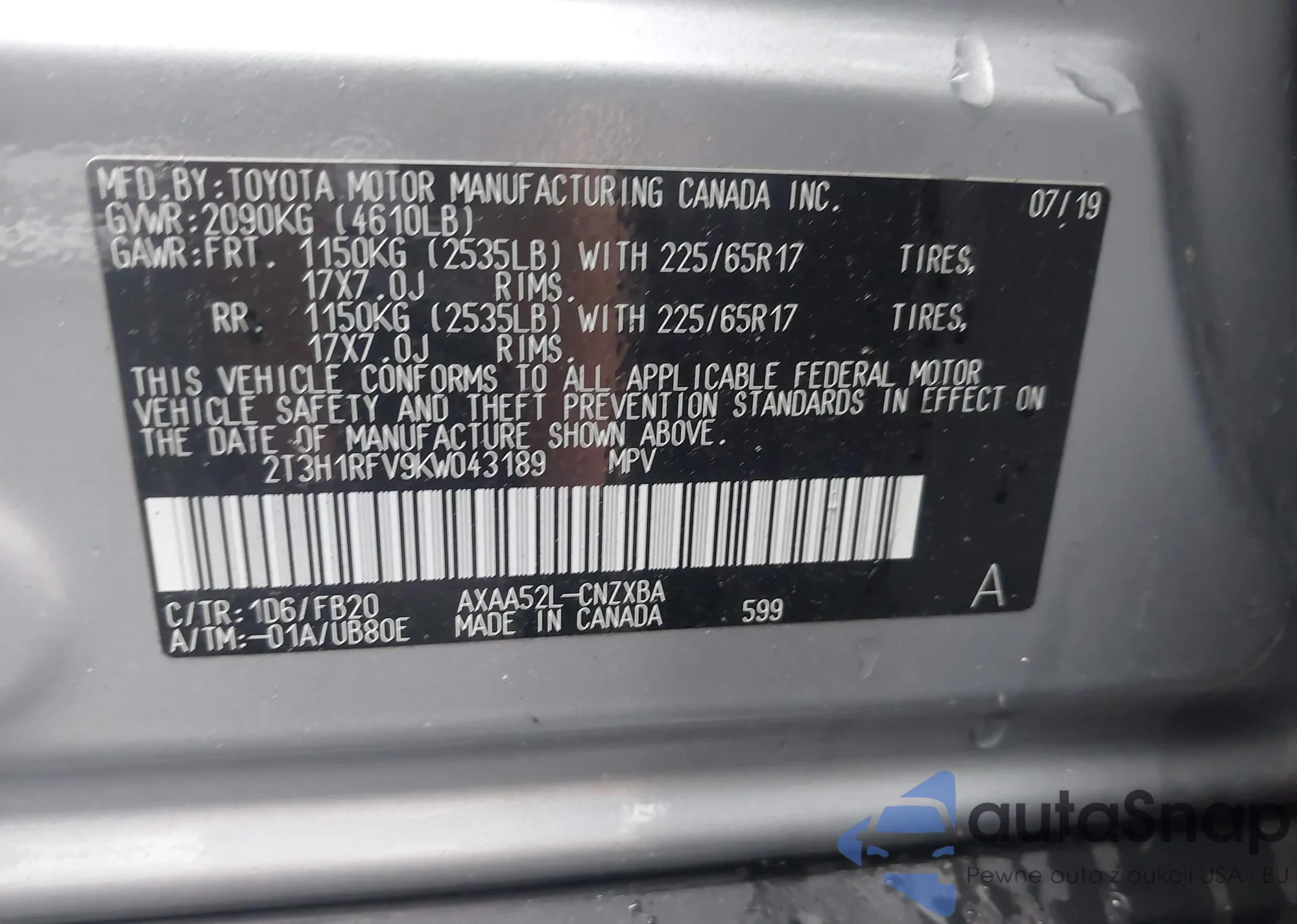 • VIN 2T3H1RFV9KW043189