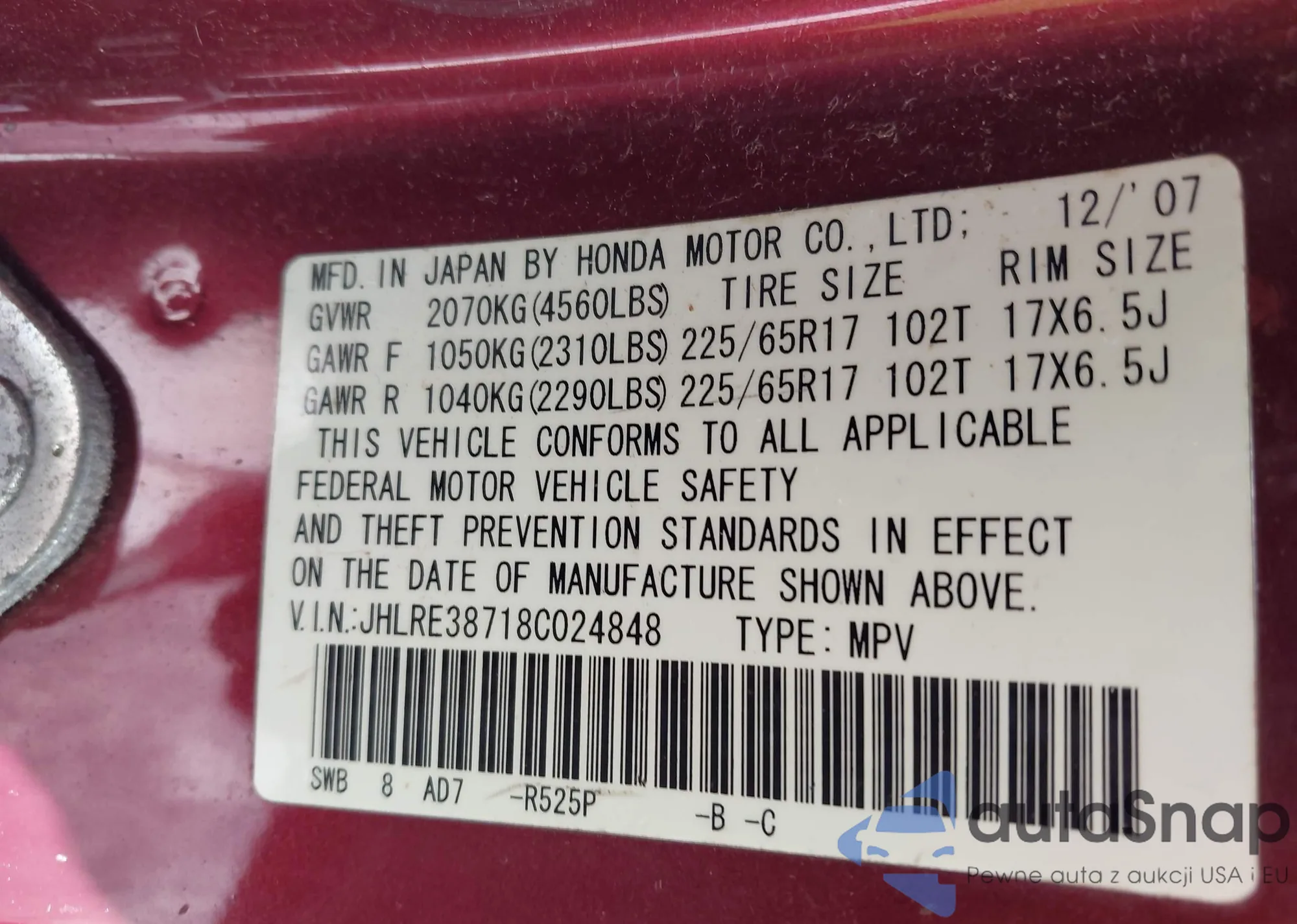 LOT: 42712271 VIN: JHLRE38718C024848