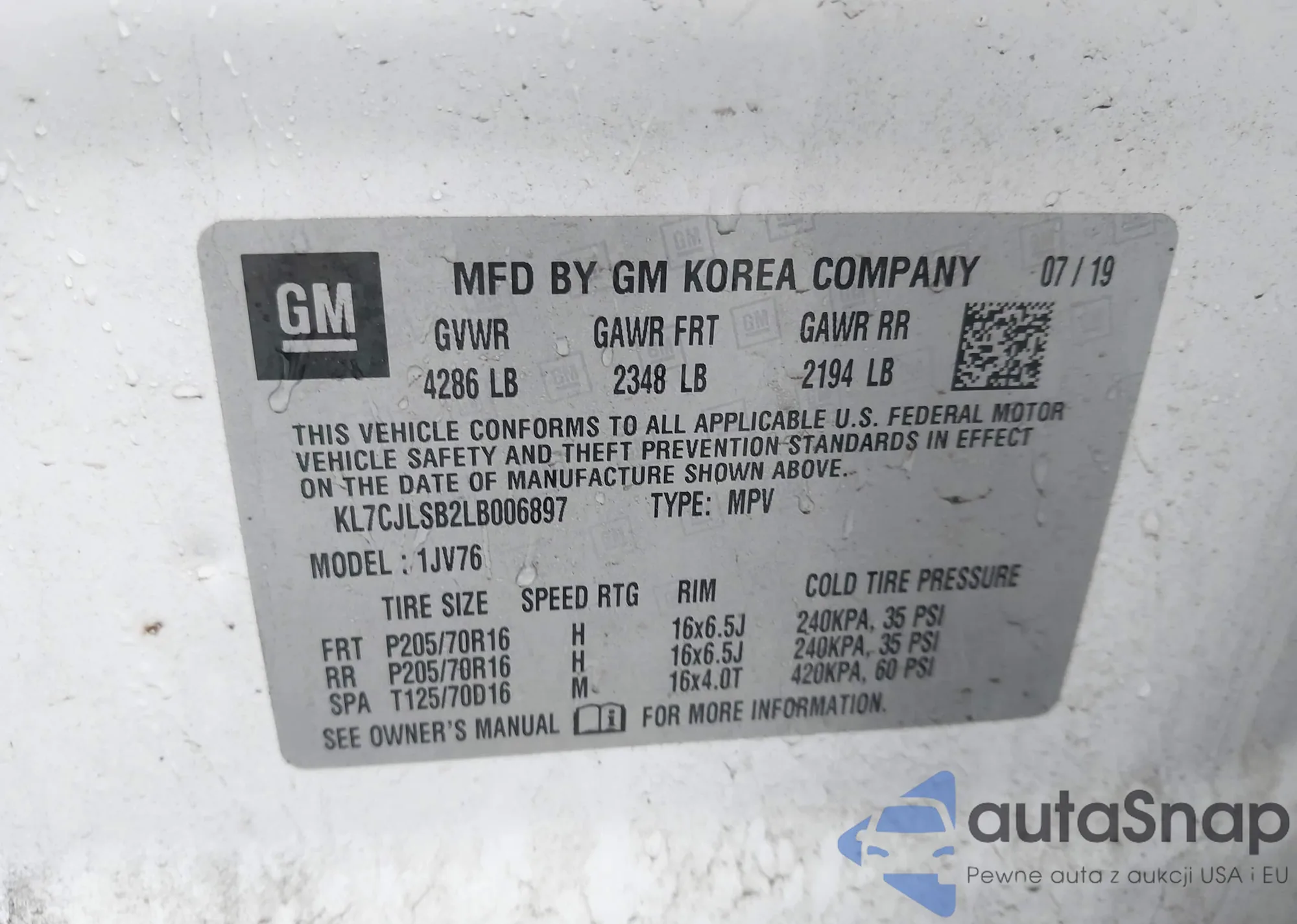 • VIN KL7CJLSB2LB006897