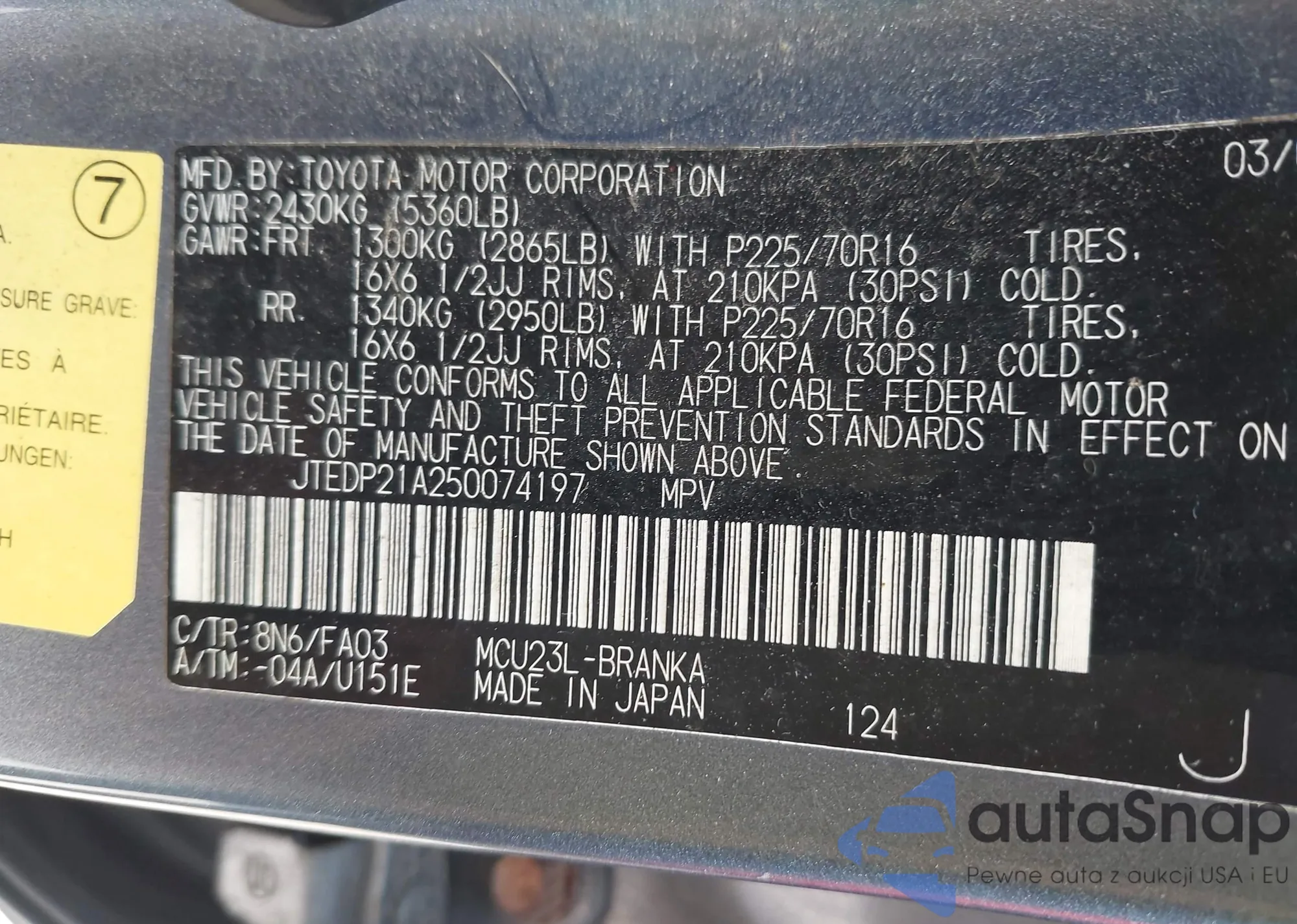 LOT: 42738786 VIN: JTEDP21A250074197