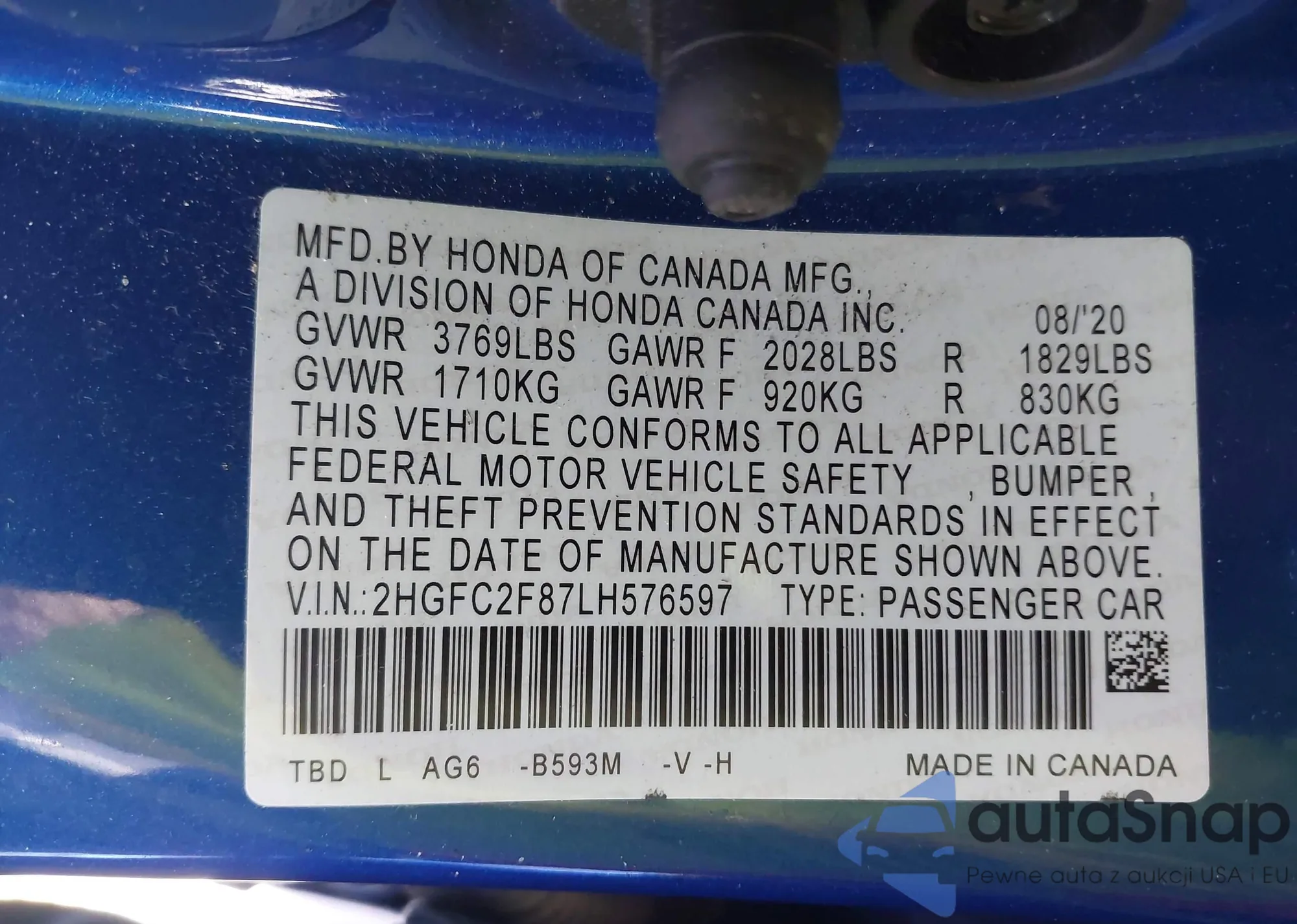 • VIN 2HGFC2F87LH576597