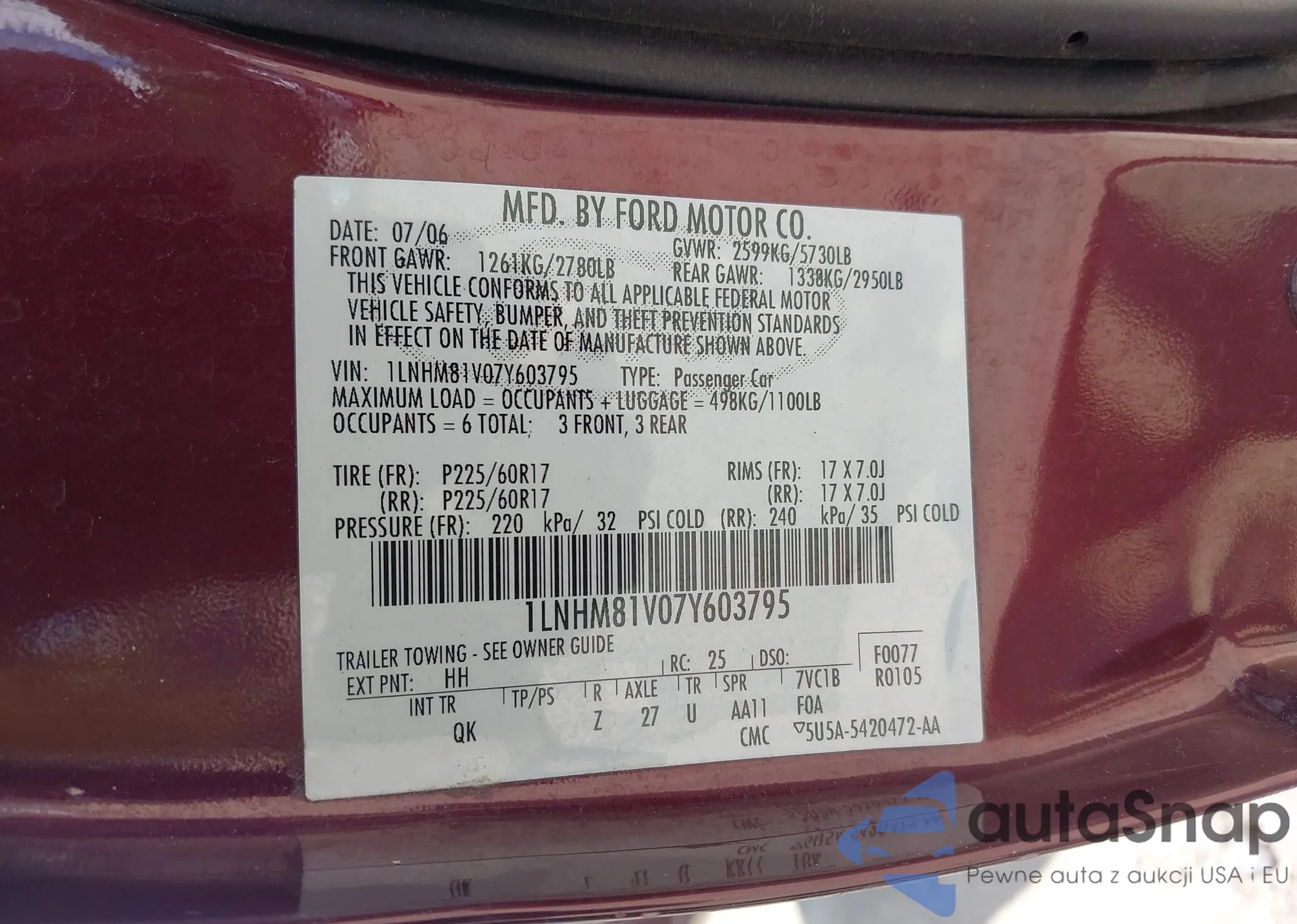 LOT: 42622392 VIN: 1LNHM81V07Y603795