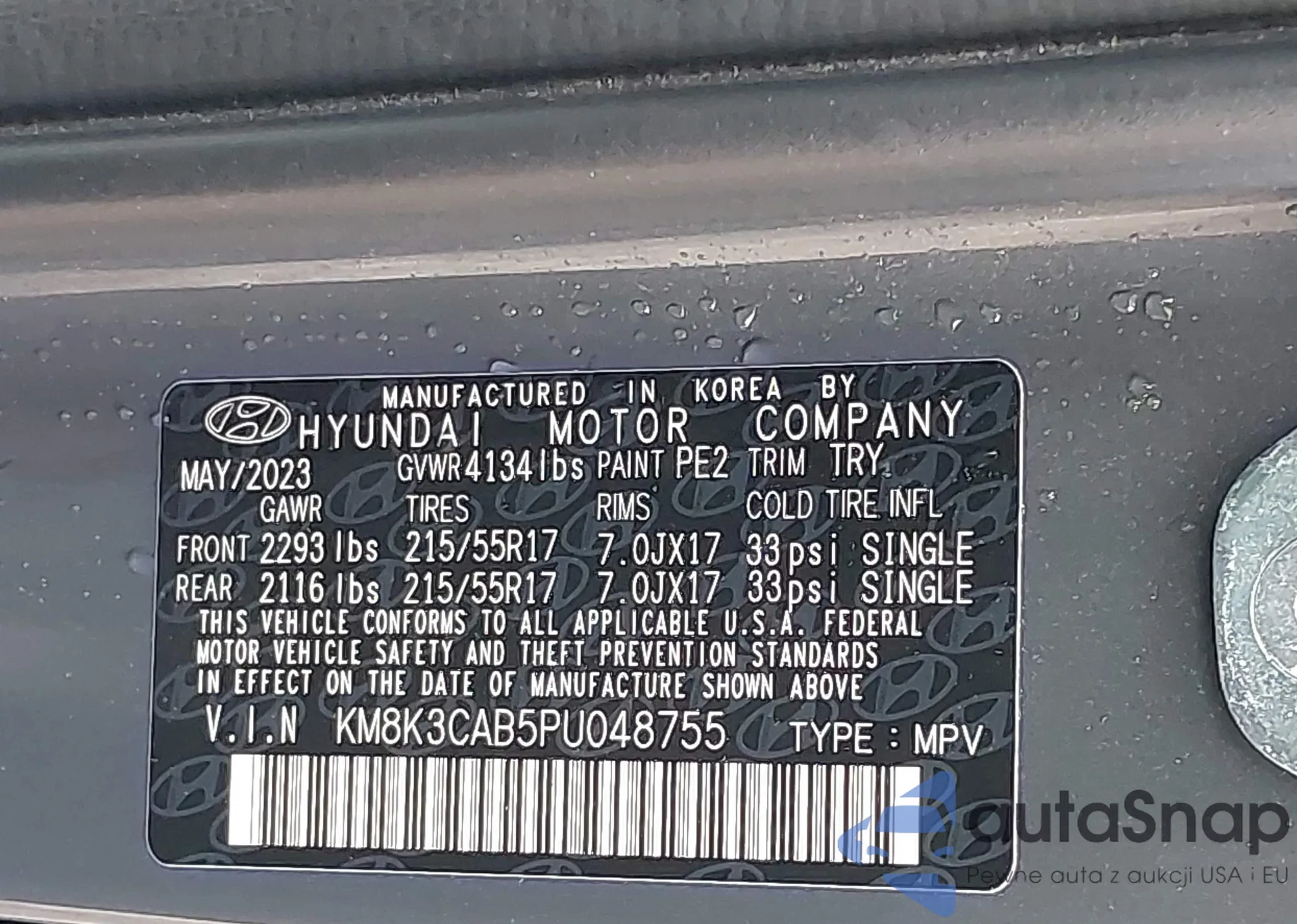 • VIN KM8K3CAB5PU048755