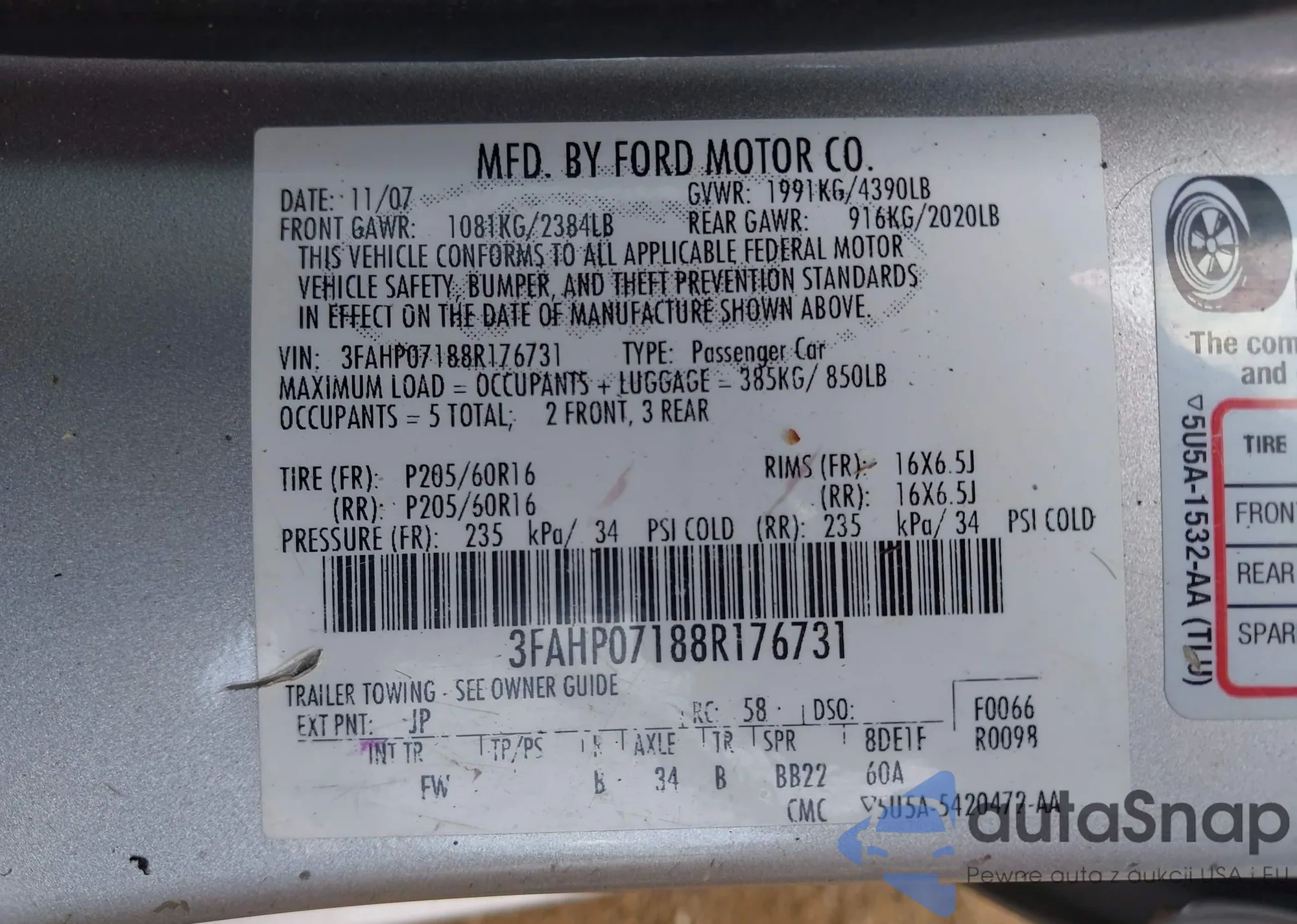 LOT: 42693960 VIN: 3FAHP07188R176731