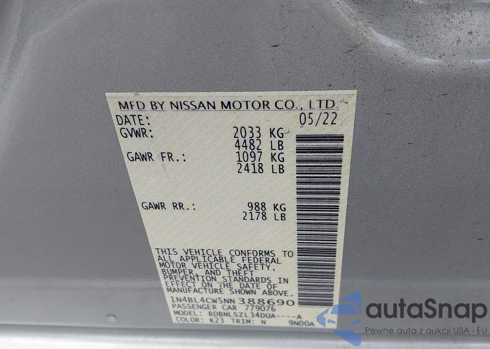 LOT: 42176908 VIN: 1N4BL4CW5NN388690