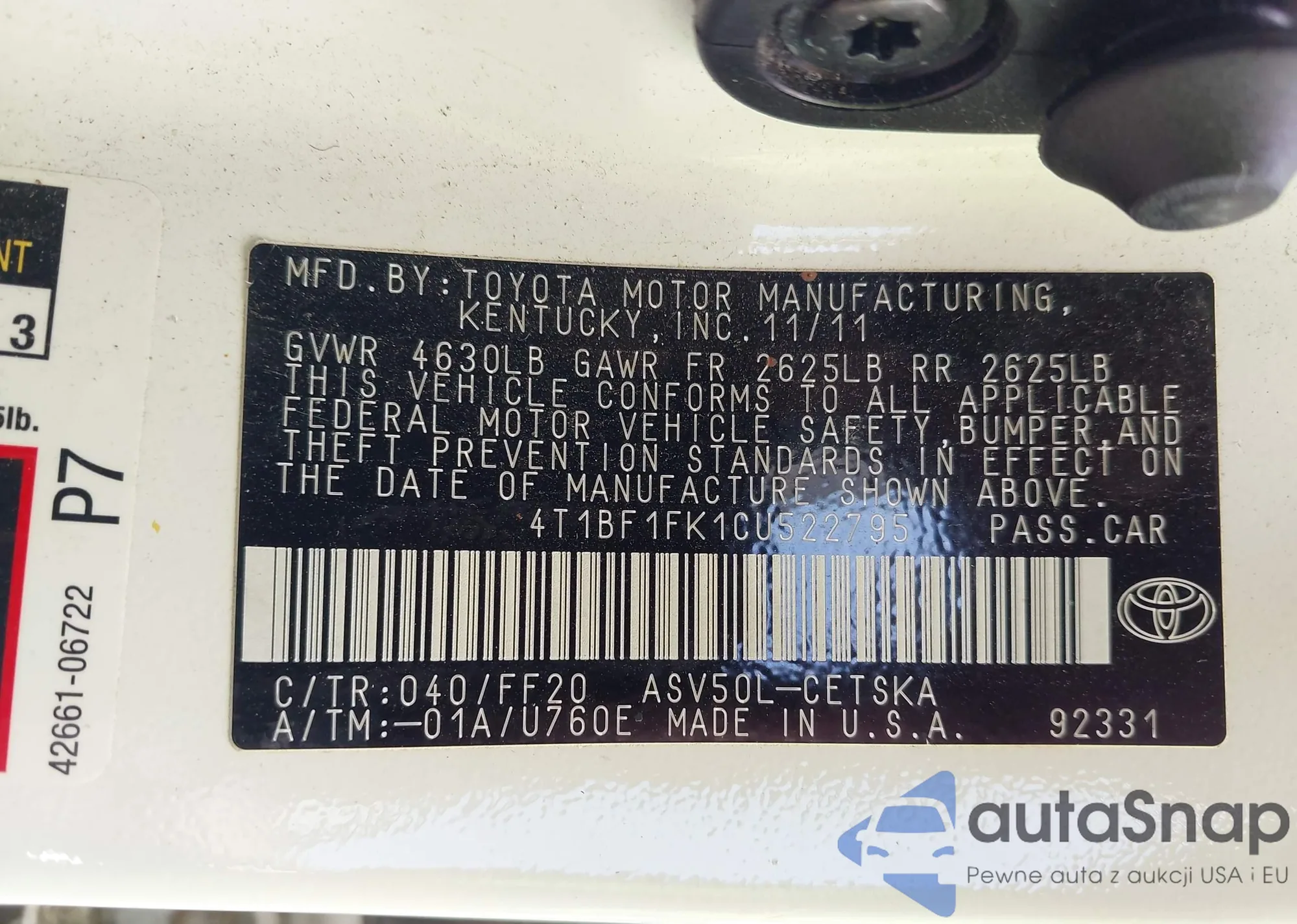 • VIN 4T1BF1FK1CU522795