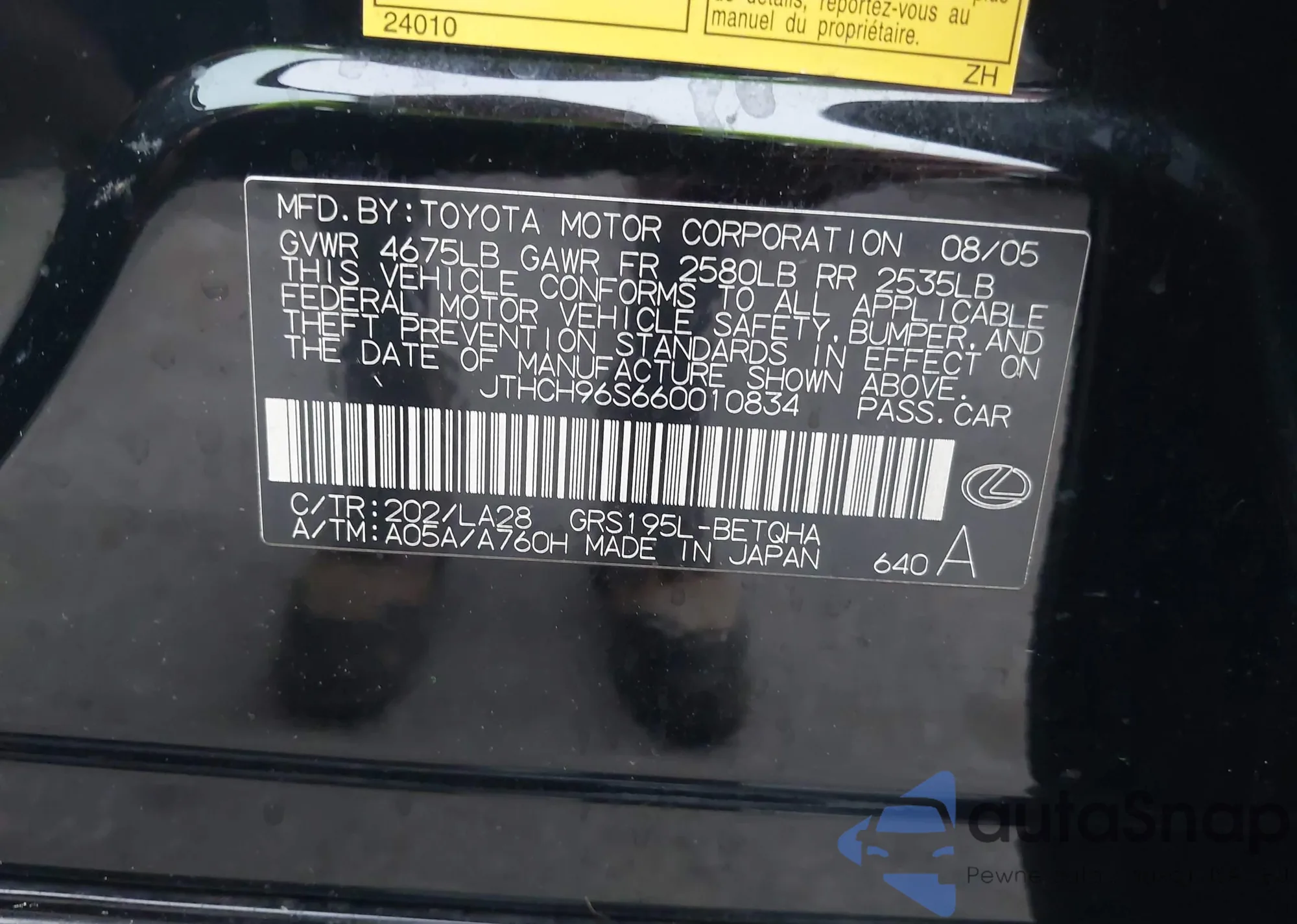 LOT: 42609767 VIN: JTHCH96S660010834