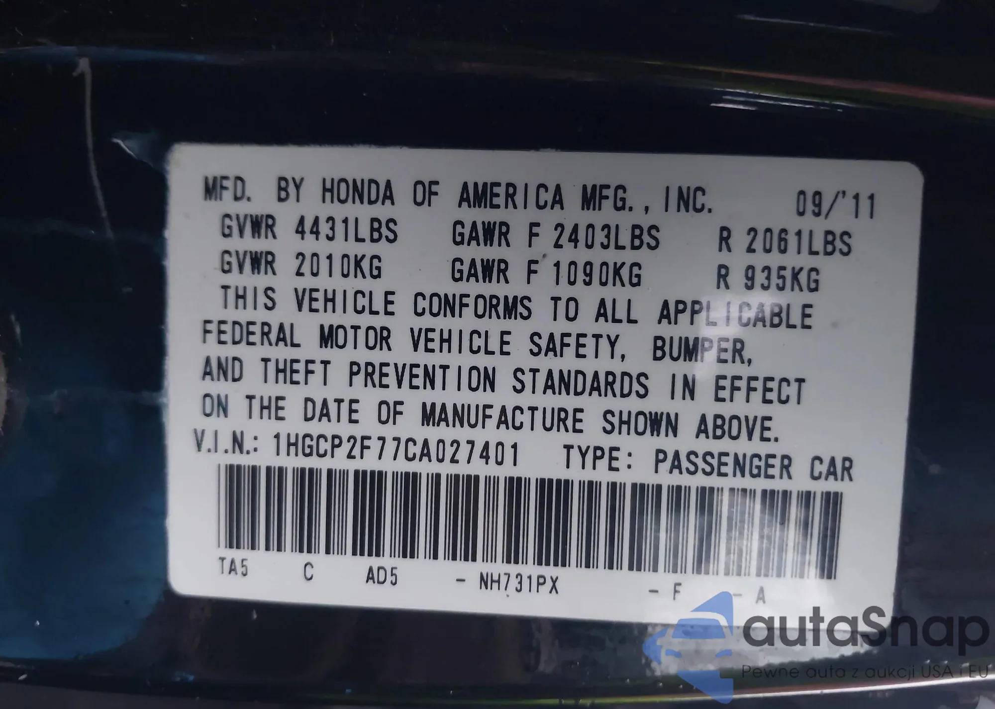 LOT: 42585028 VIN: 1HGCP2F77CA027401