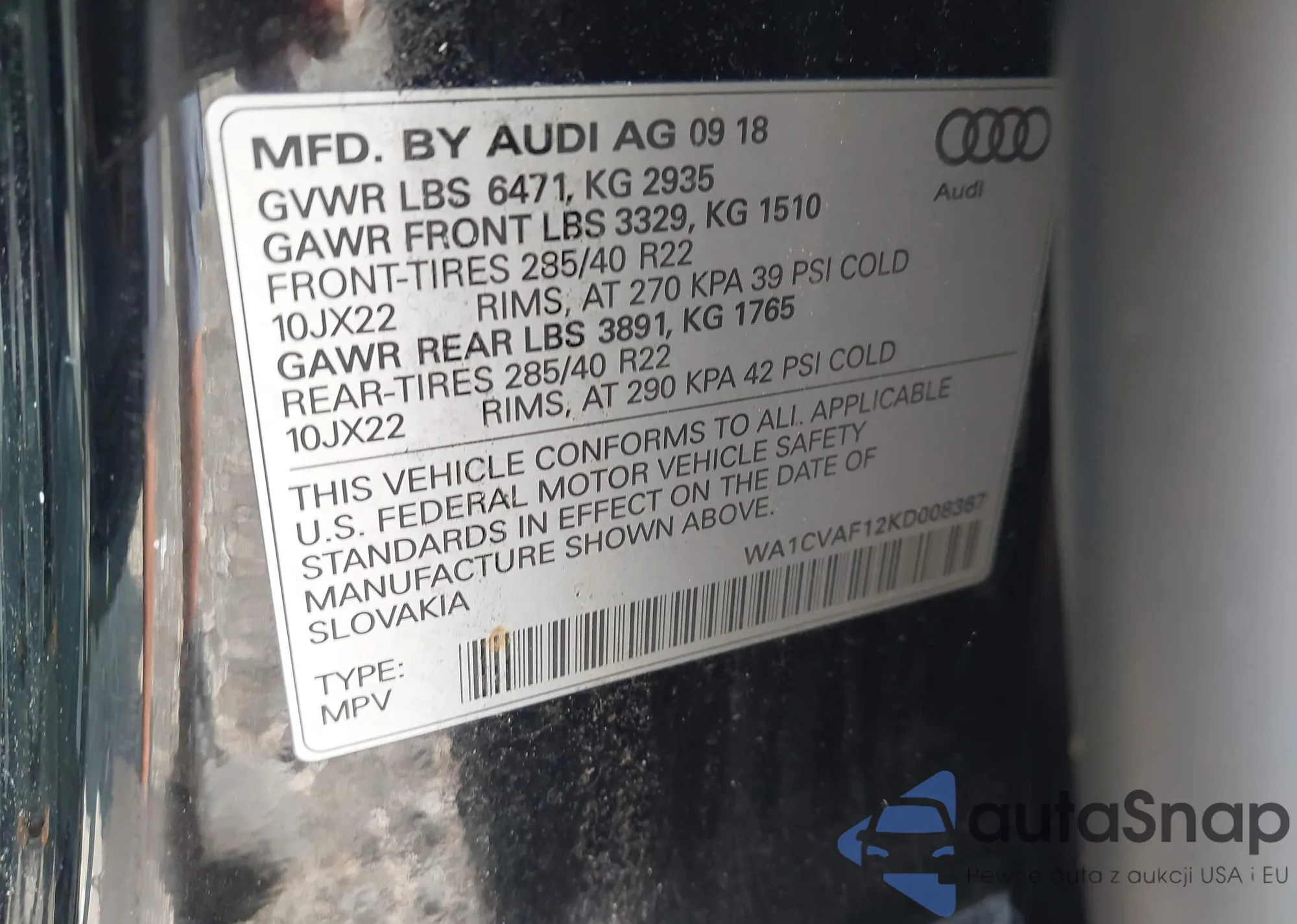 LOT: 42544227 VIN: WAUWFAFL5CA112109