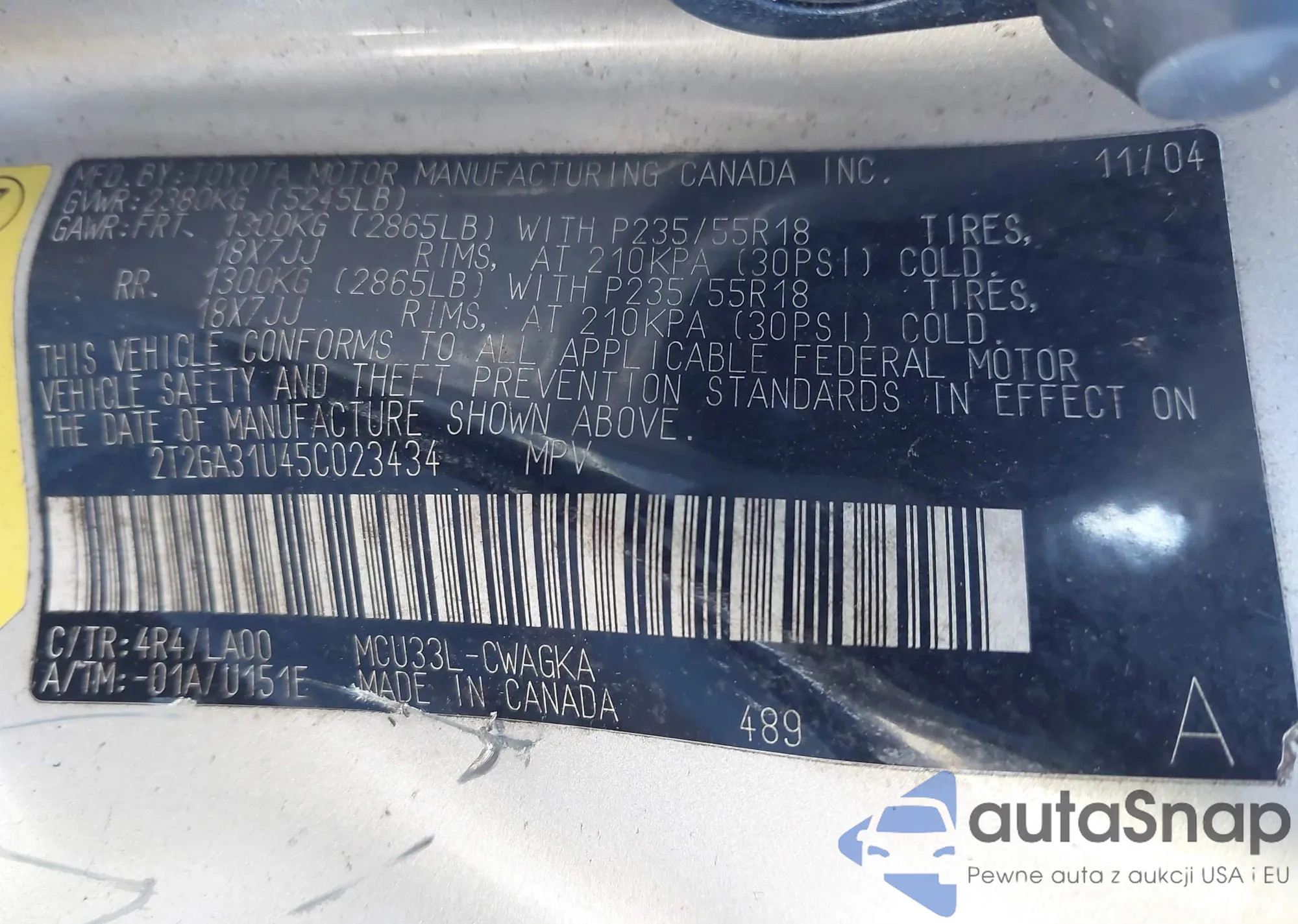 • VIN 2T2GA31U45C023434