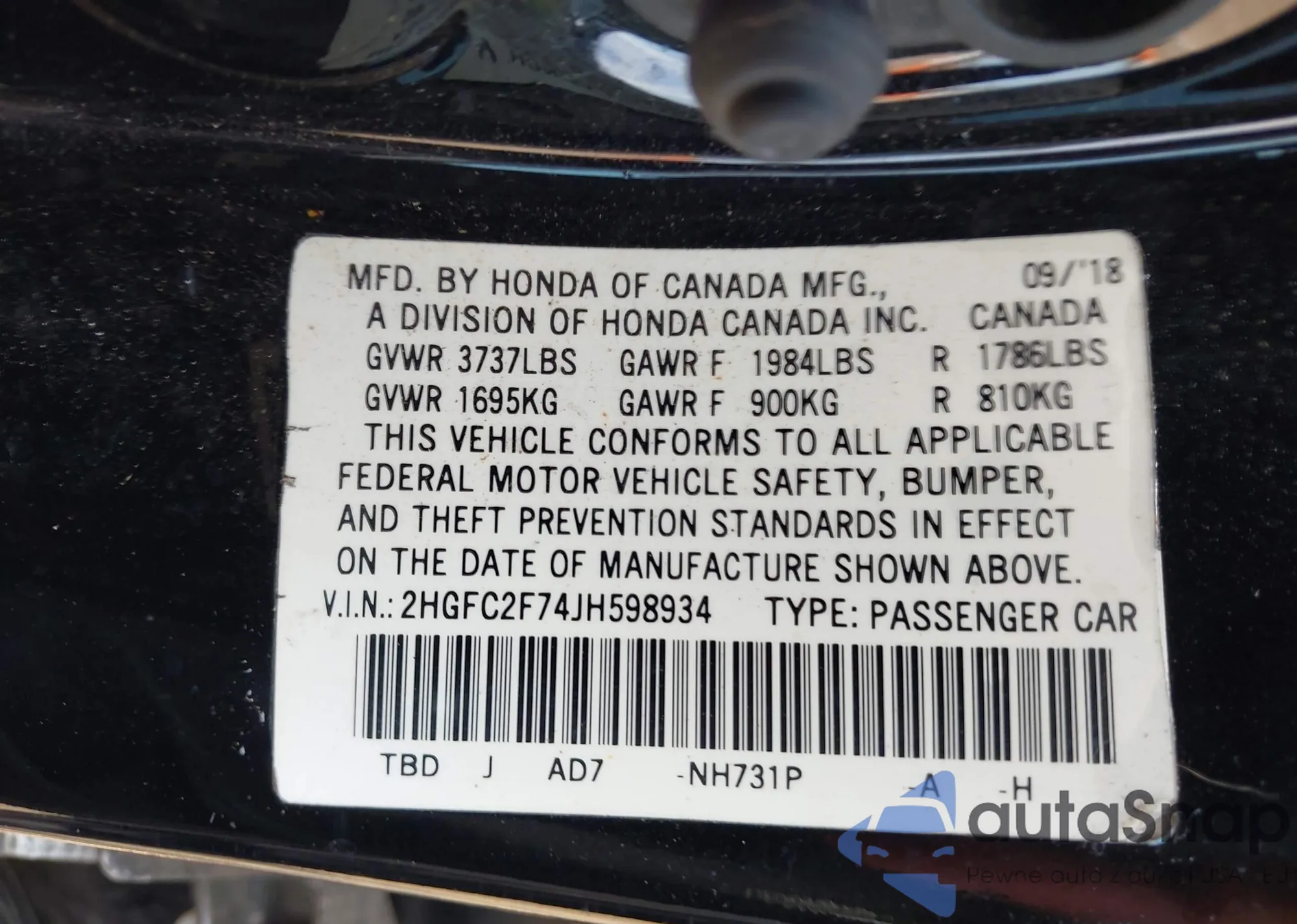 • VIN 2HGFC2F74JH598934