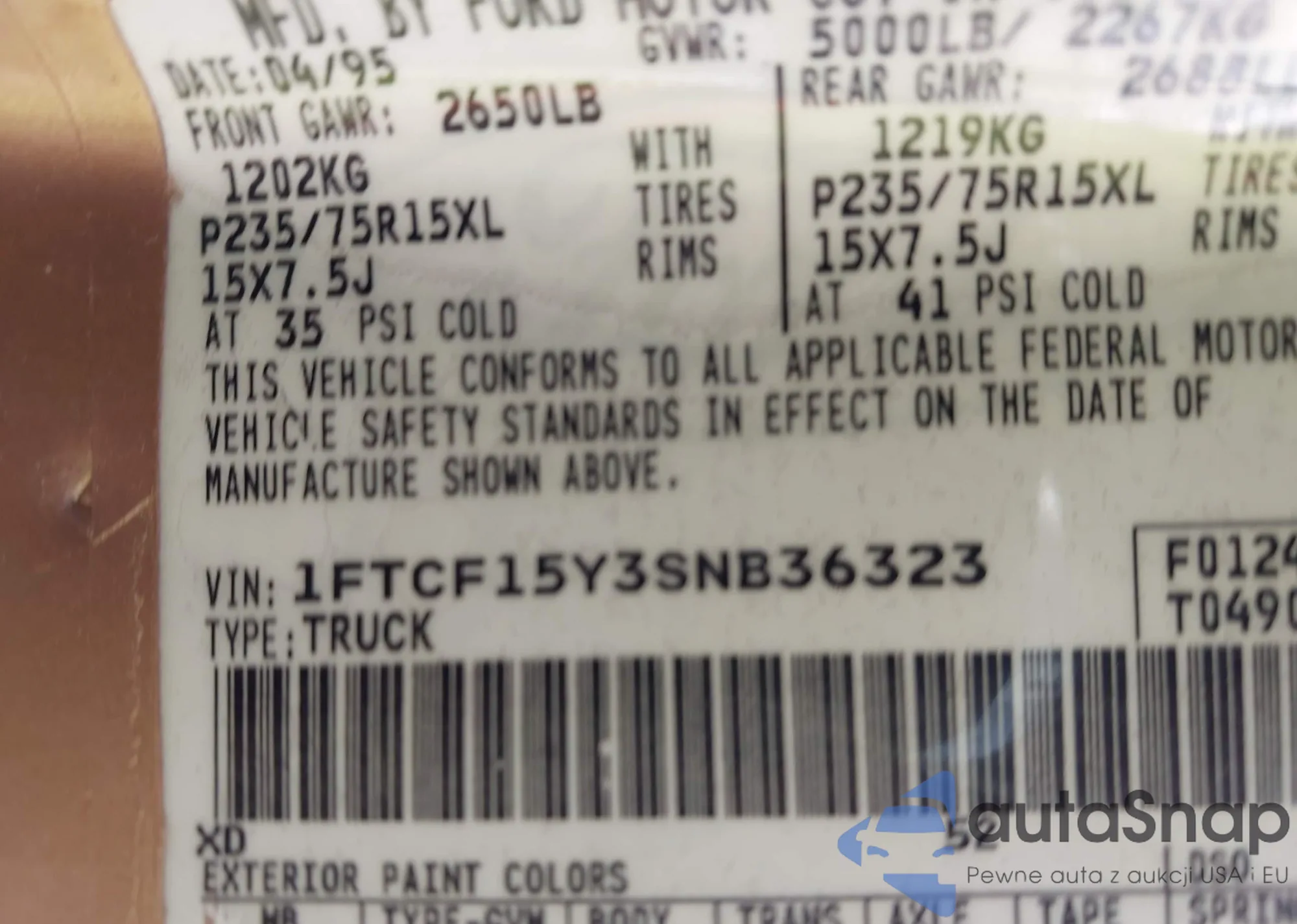 LOT: 42848517 VIN: 1FTCF15Y3SNB36323