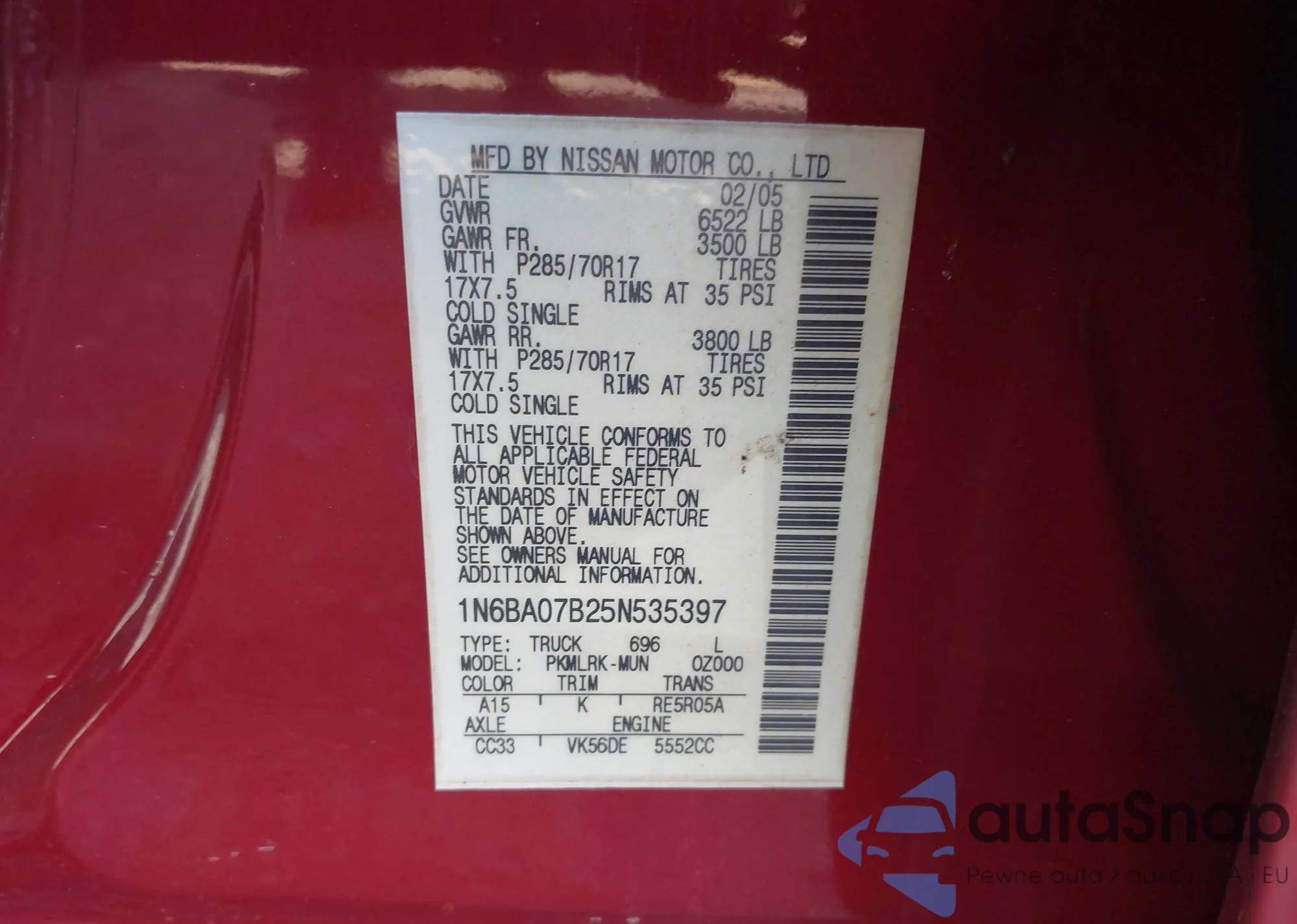 • VIN 1N6BA07B25N535397