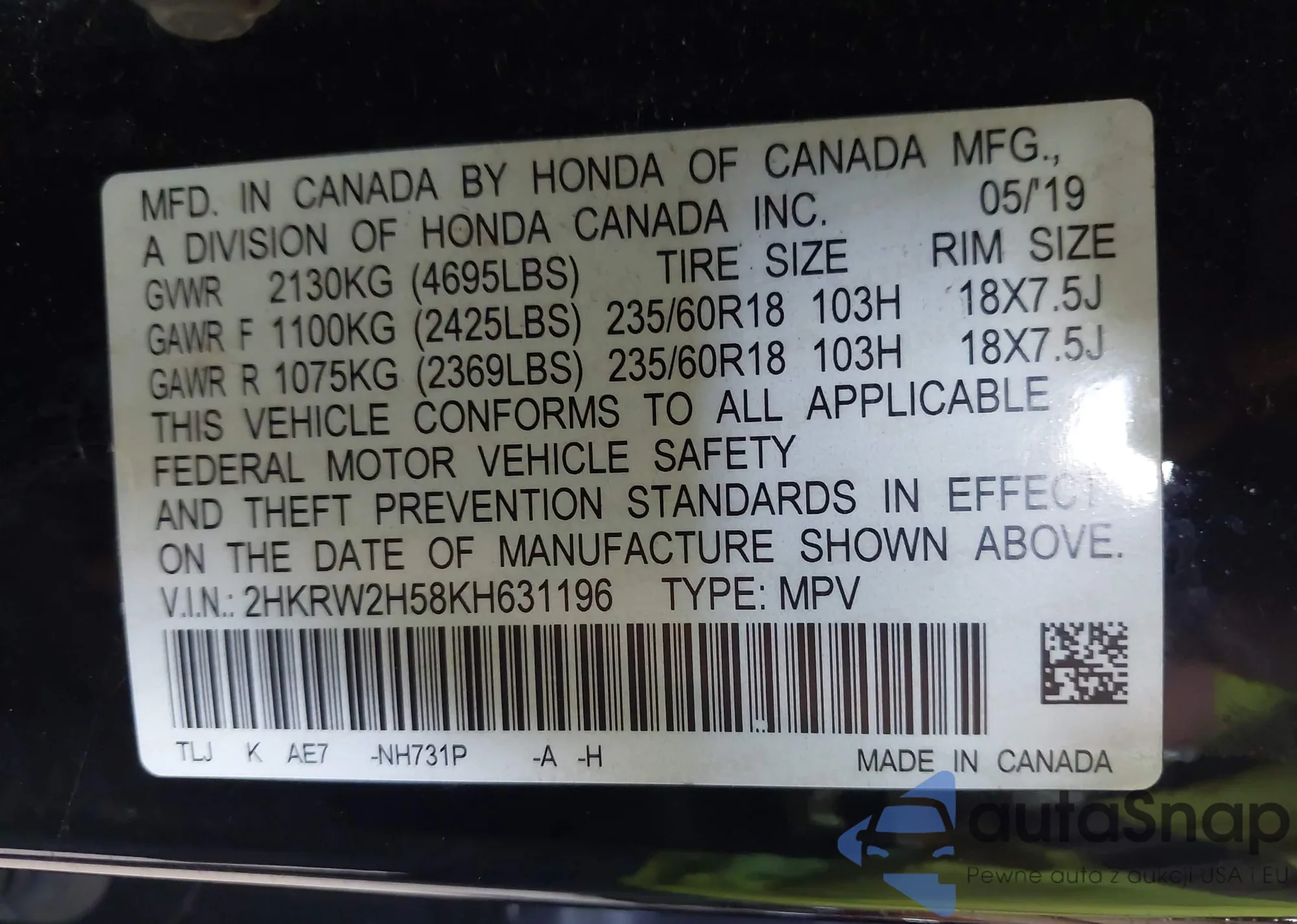• VIN 2HKRW2H58KH631196