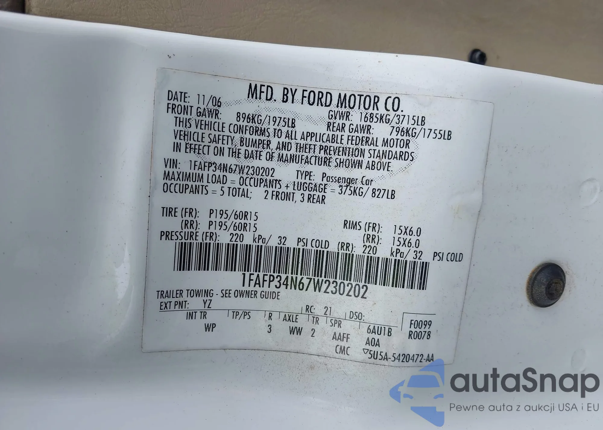 LOT: 42810292 VIN: 1FAFP34N67W230202