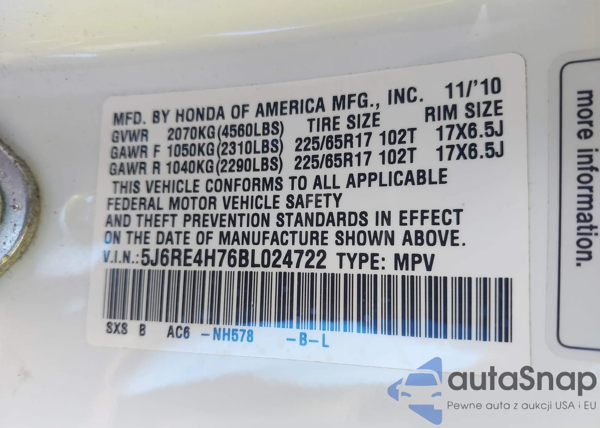 • VIN 5J6RE4H76BL024722