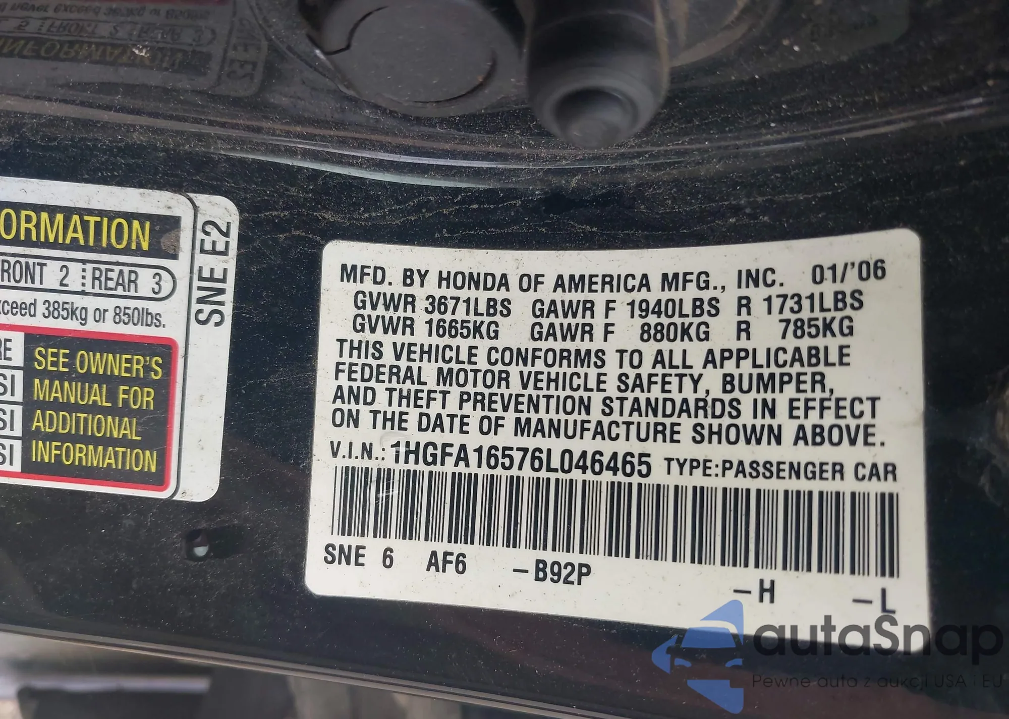 LOT: 42742579 VIN: 1HGFA16576L046465