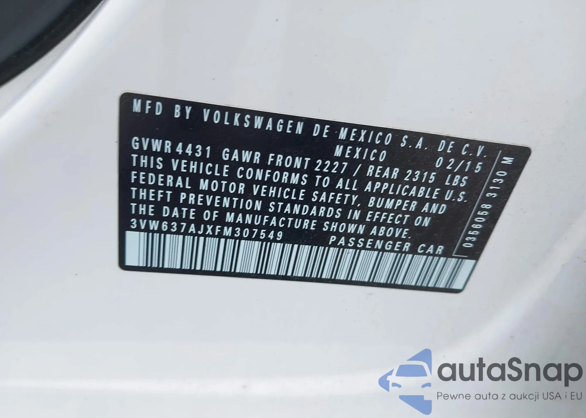 • VIN 3VW637AJXFM307549
