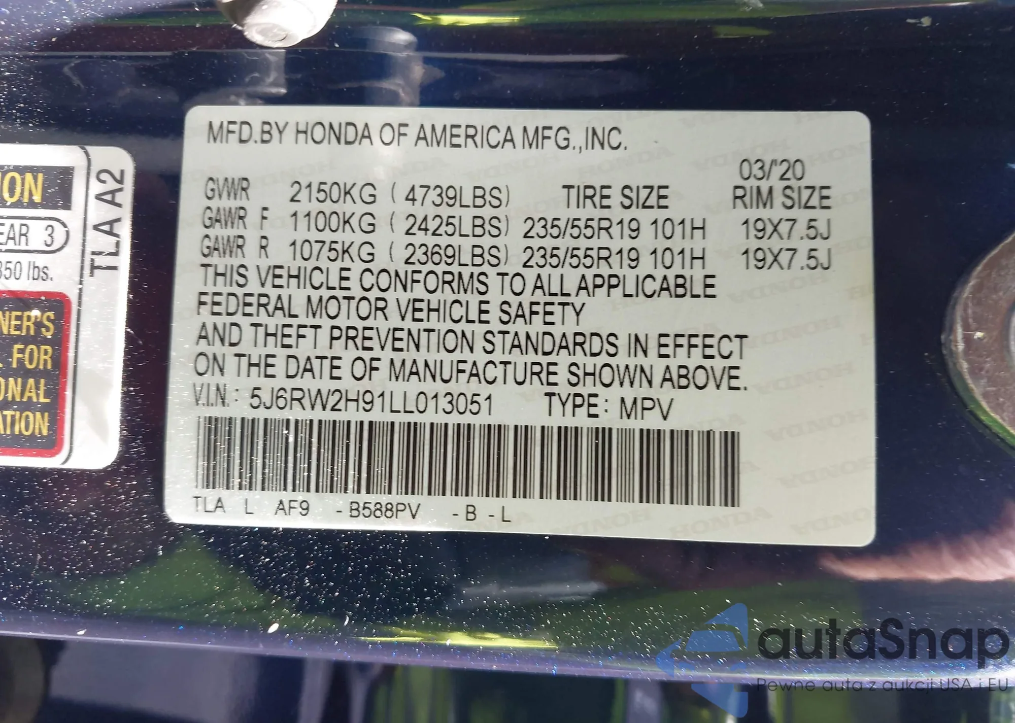 • VIN 5J6RW2H91LL013051