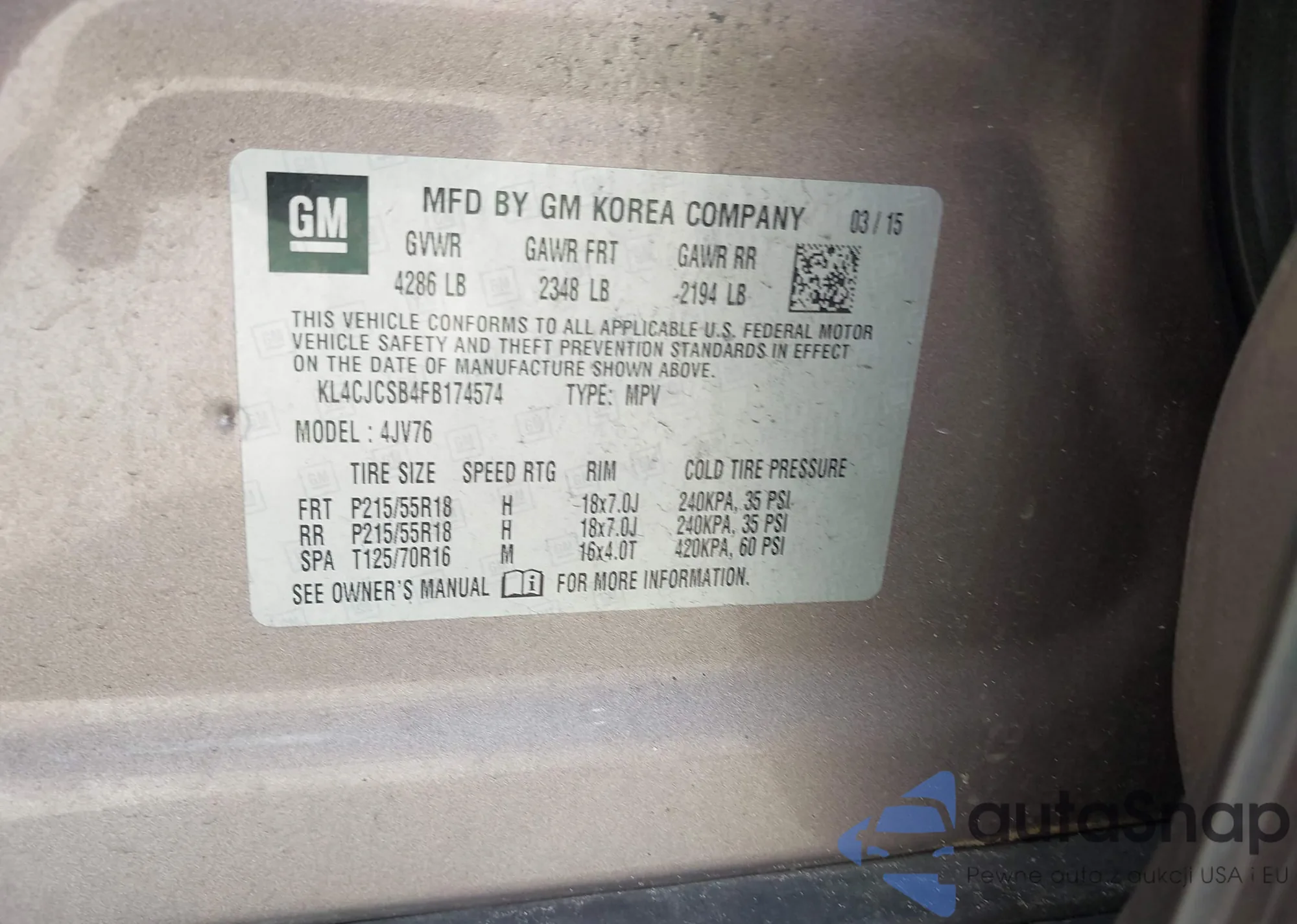 • VIN KL4CJCSB4FB174574