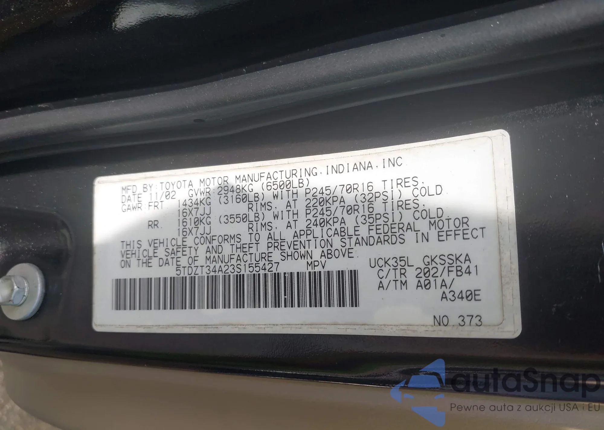 • VIN 5TDZT34A23S155427