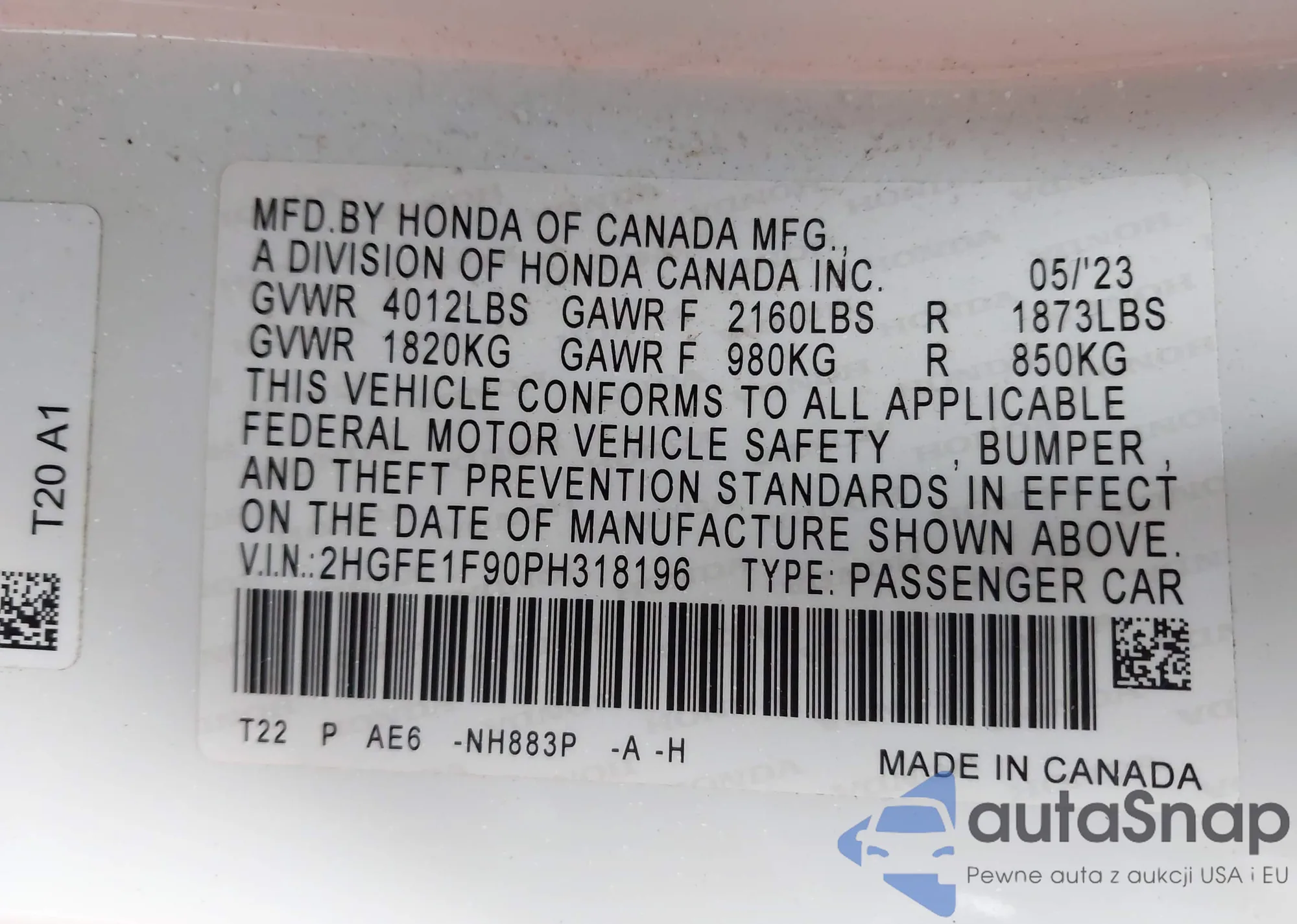 LOT: 42469743 VIN: 2HGFE1F90PH318196