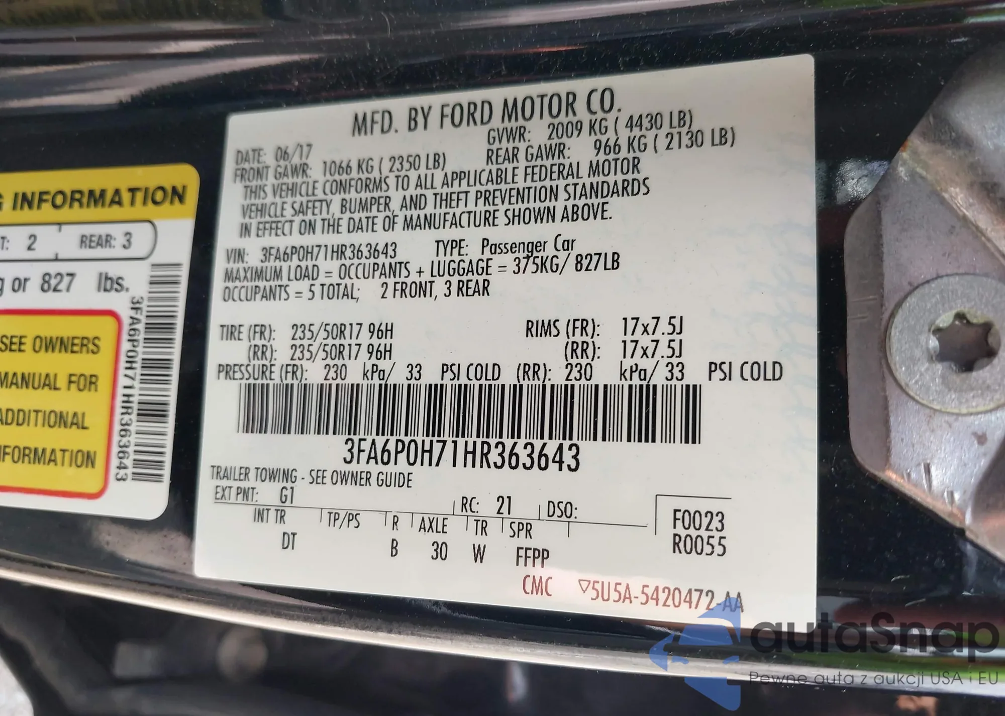 LOT: 42629500 VIN: WBAJA5C39HG895508