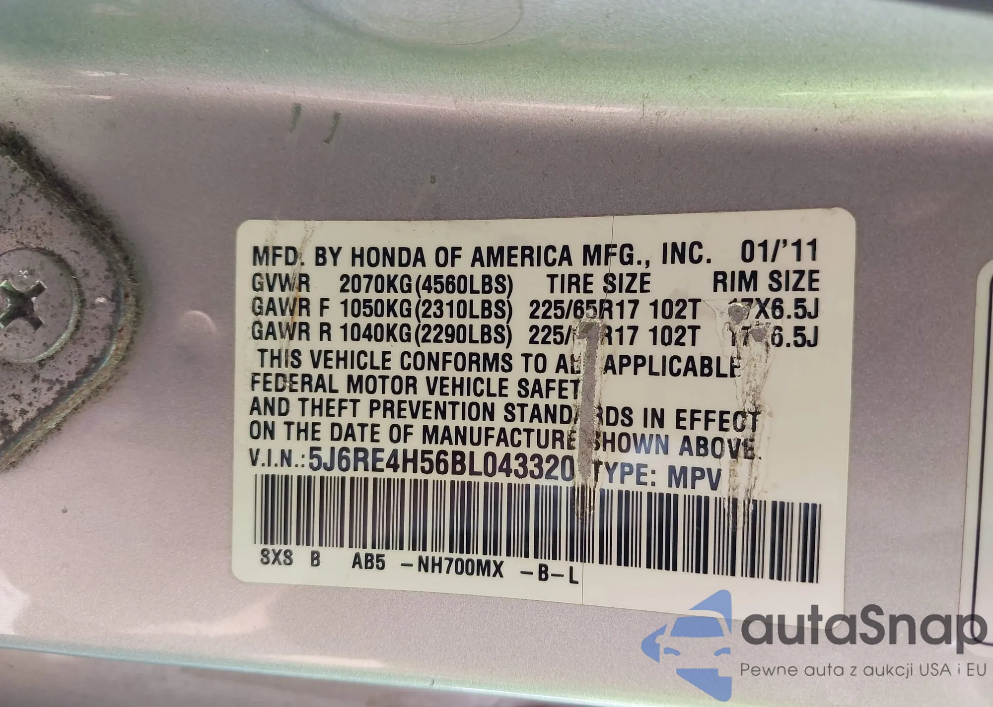 • VIN 5J6RE4H56BL043320