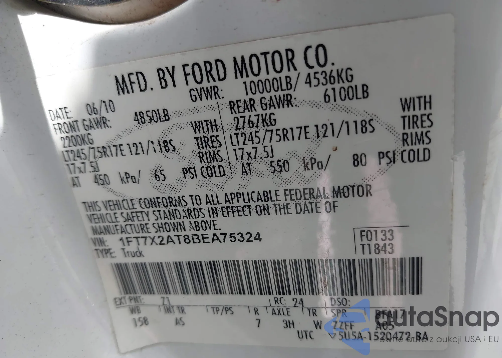 • VIN 1FT7X2AT8BEA75324