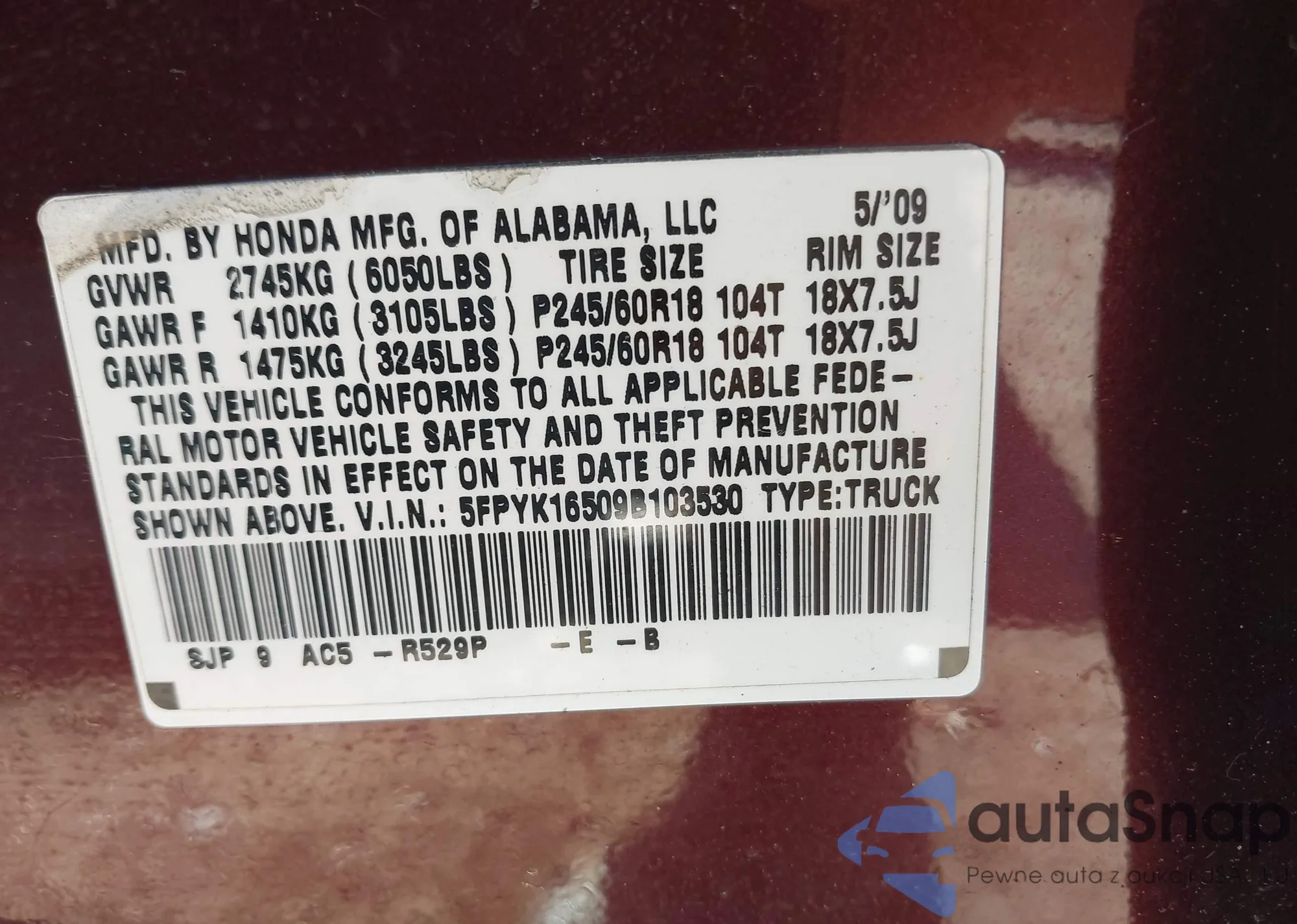 • VIN 5FPYK16509B103530