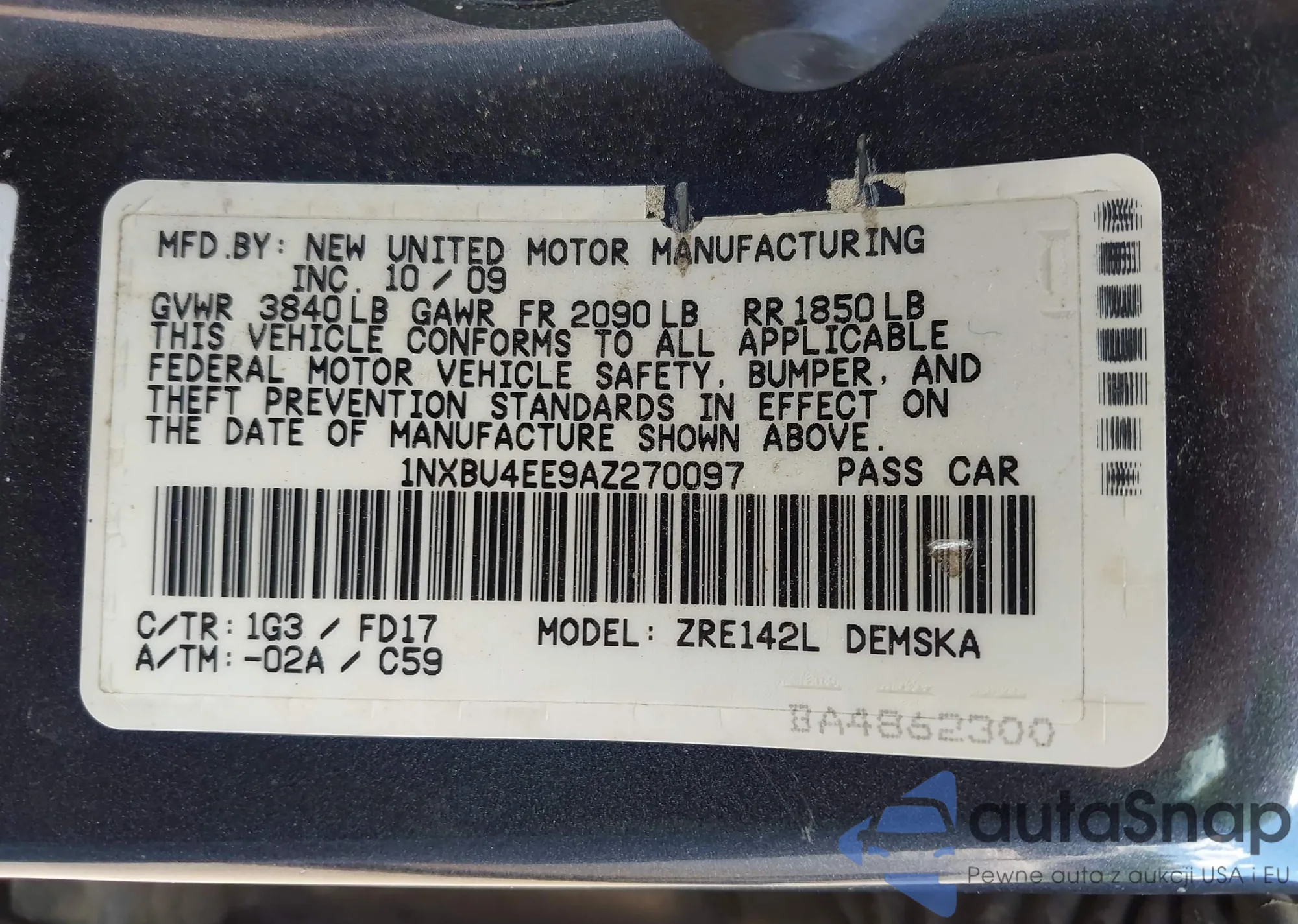 LOT: 42793723 VIN: 1NXBU4EE9AZ270097