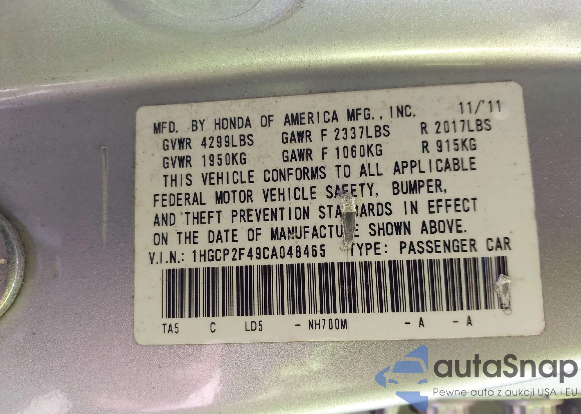 LOT: 42592836 VIN: 1HGCP2F49CA048465