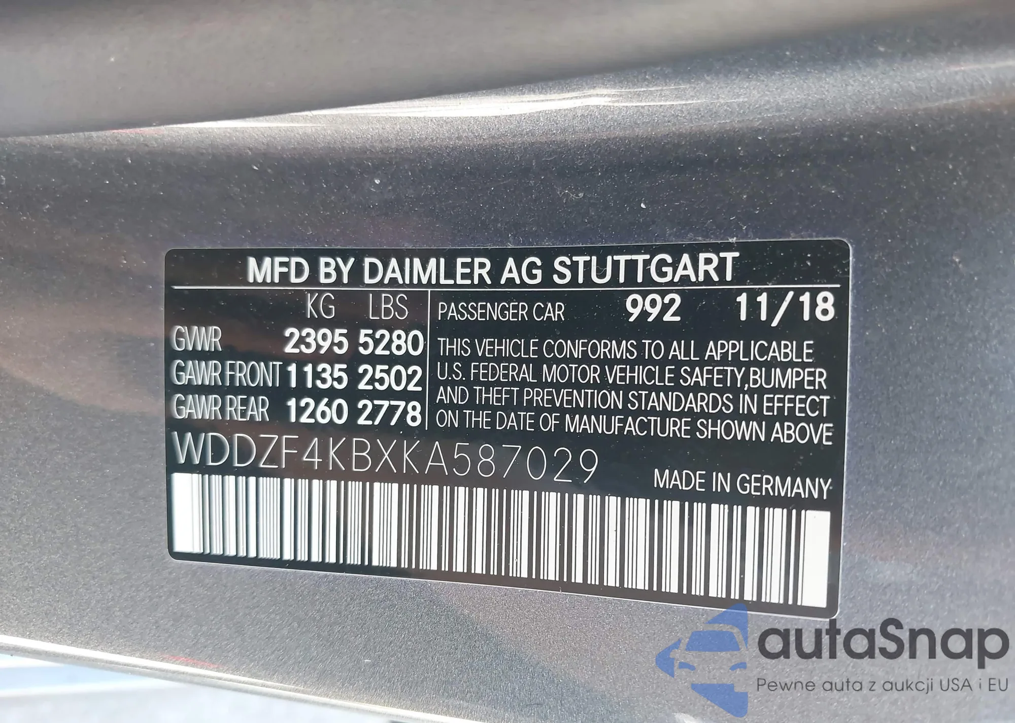 LOT: 42727275 VIN: WDDZF4KBXKA587029