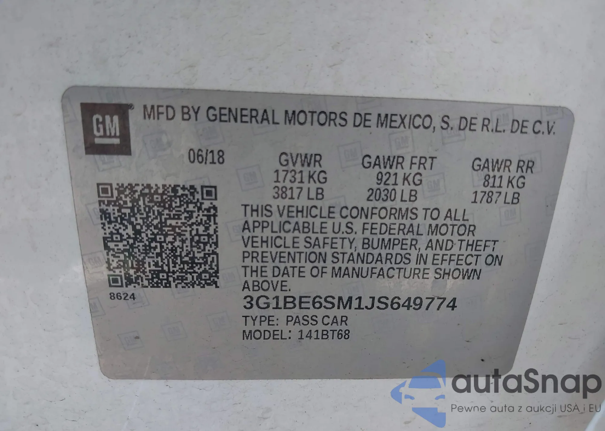 LOT: 42487313 VIN: 3G1BE6SM1JS649774