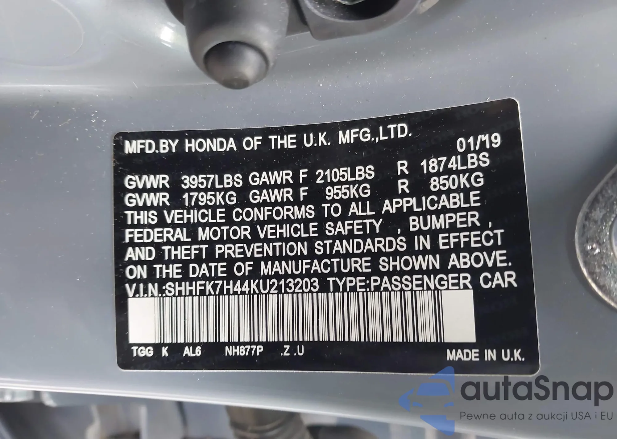 LOT: 40852230 VIN: SHHFK7H44KU213203
