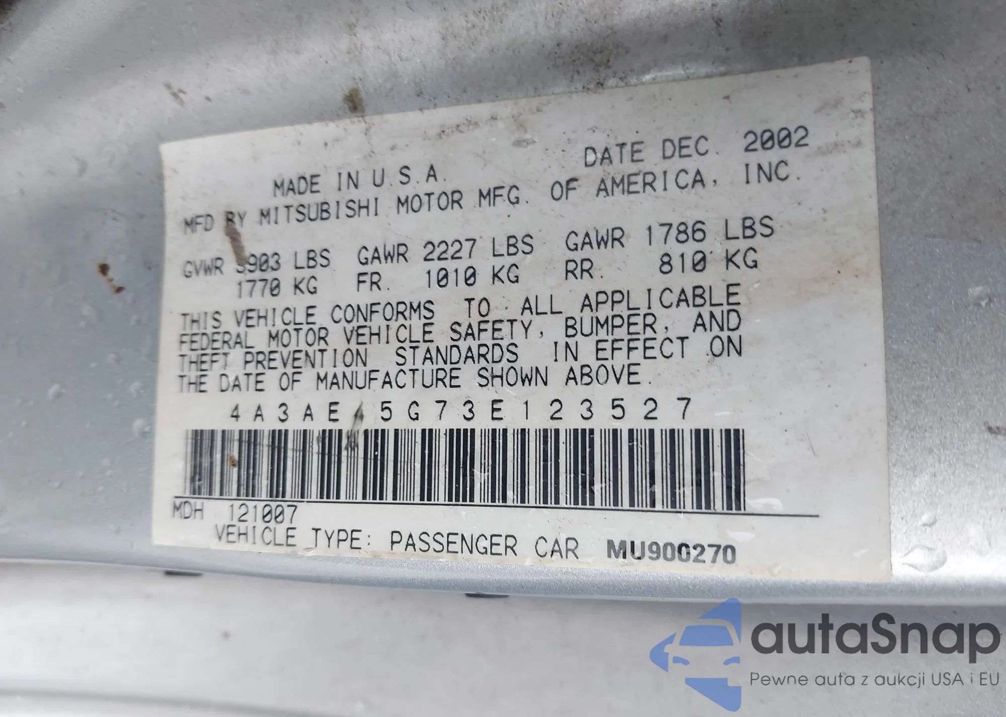 LOT: 42341343 VIN: 4A3AE45G73E123527