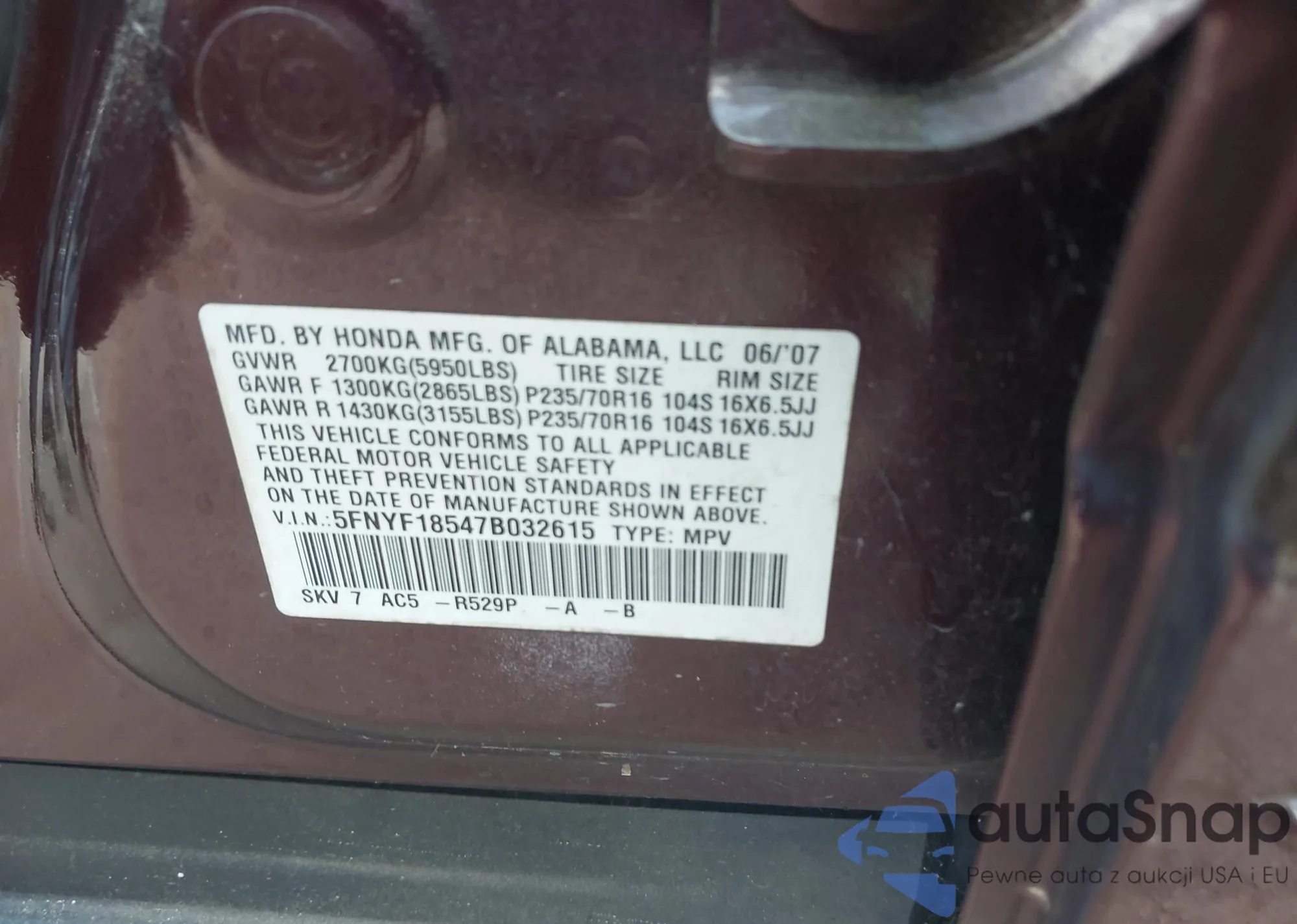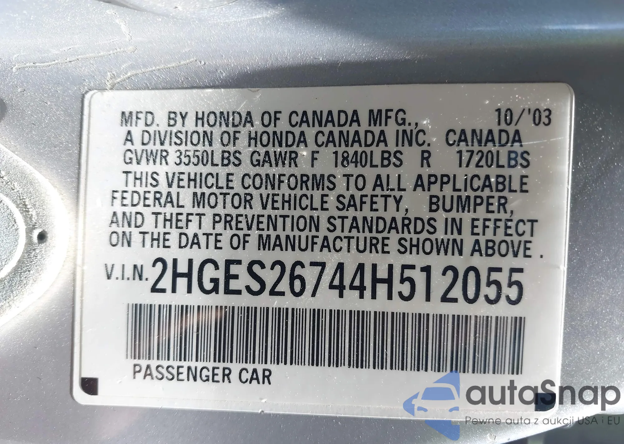 LOT: 42719284 VIN: 3HGCM56333G706882