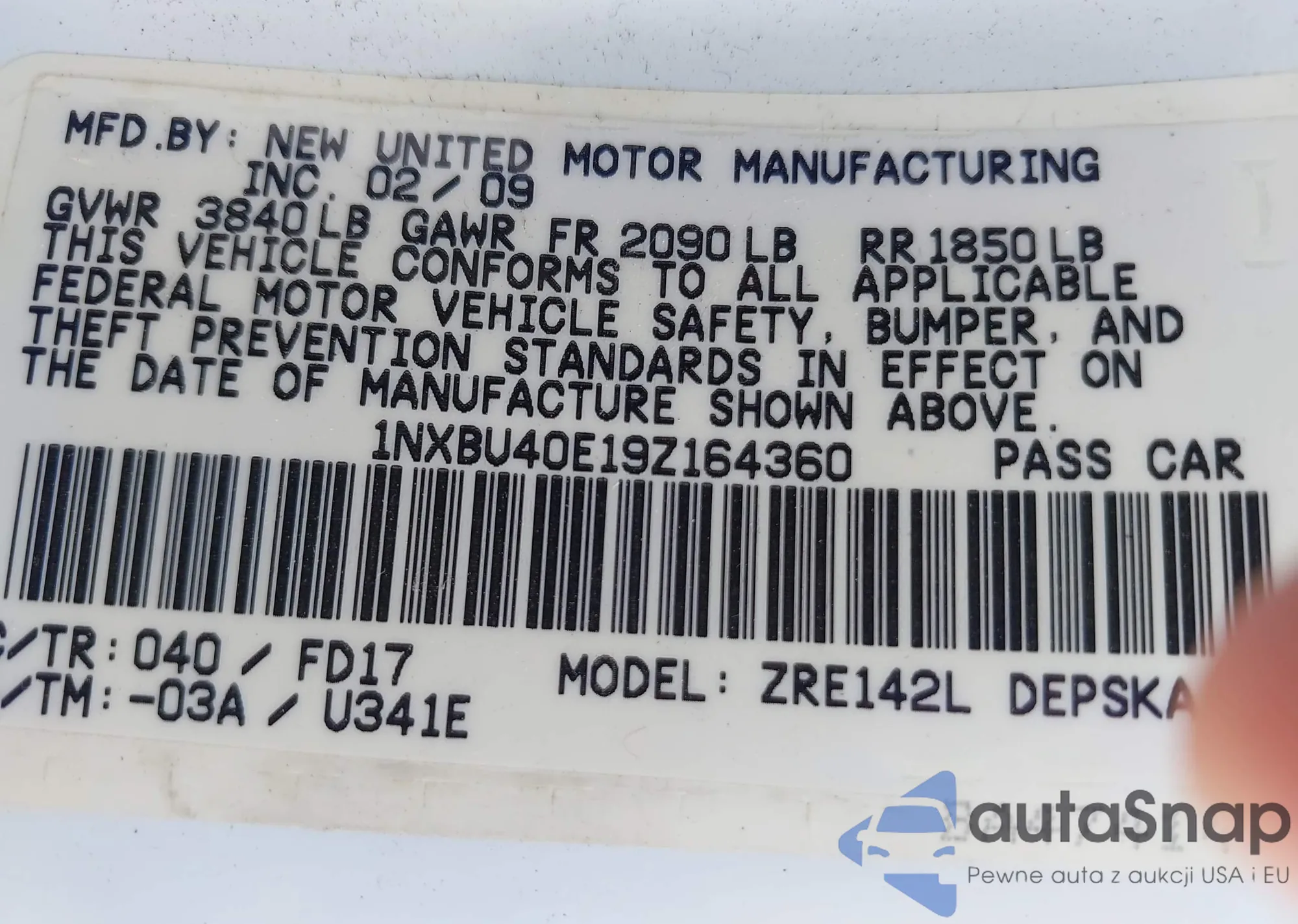 LOT: 42763556 VIN: 1NXBU40E19Z164360