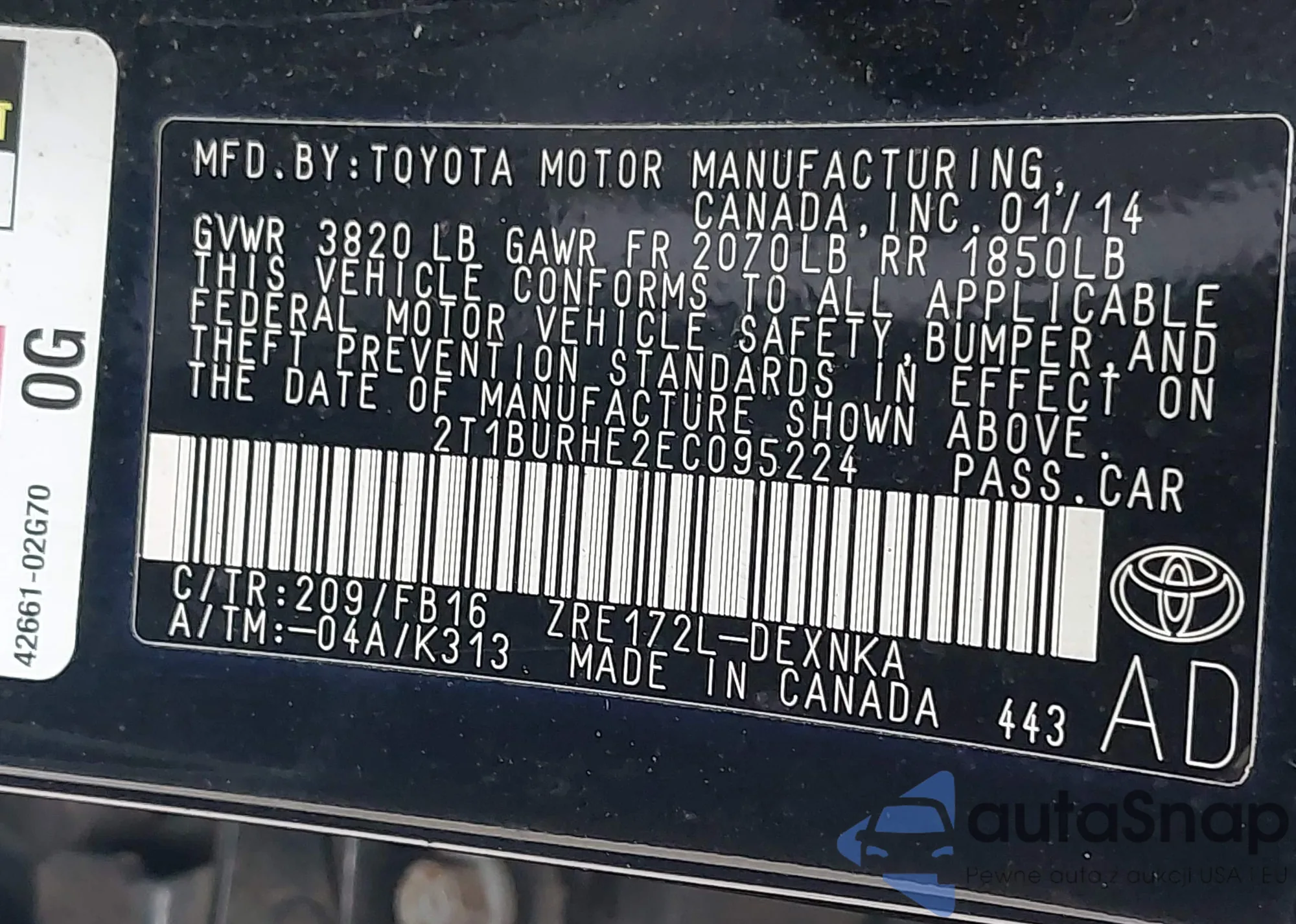 LOT: 42583075 VIN: 2T1BURHE2EC095224