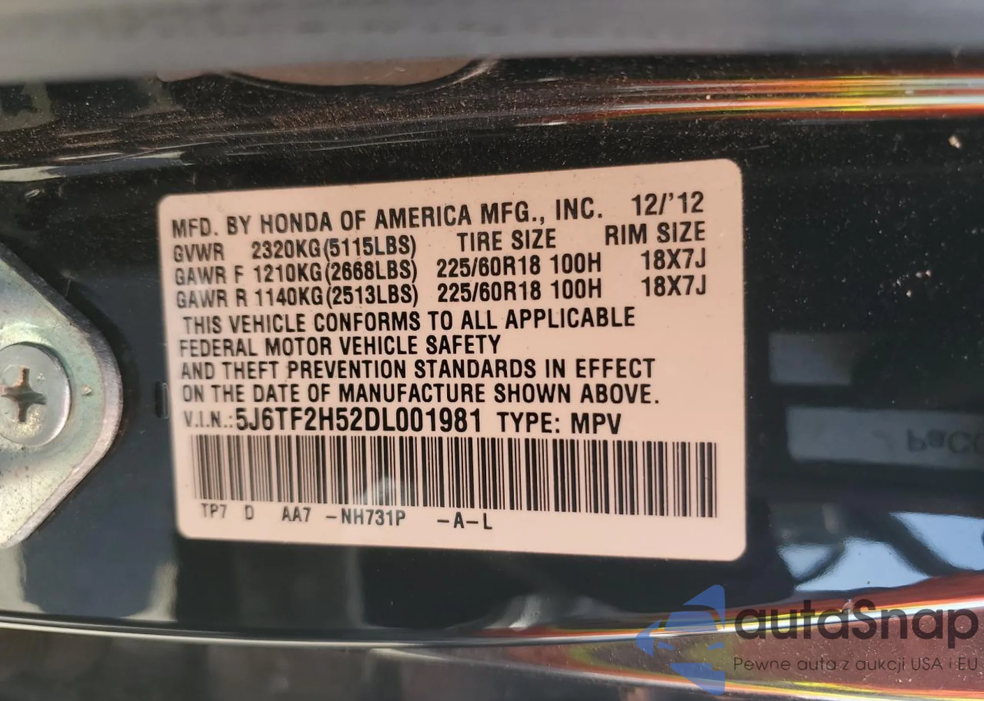 • VIN 5J6TF2H52DL001981