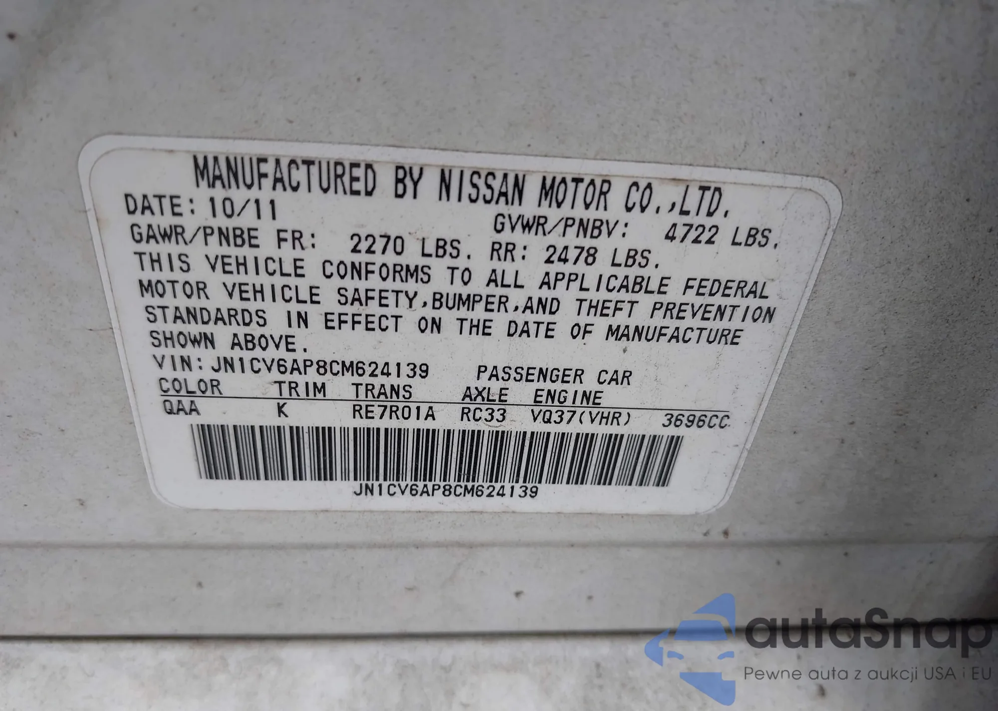 LOT: 42637816 VIN: JN1CV6AP8CM624139