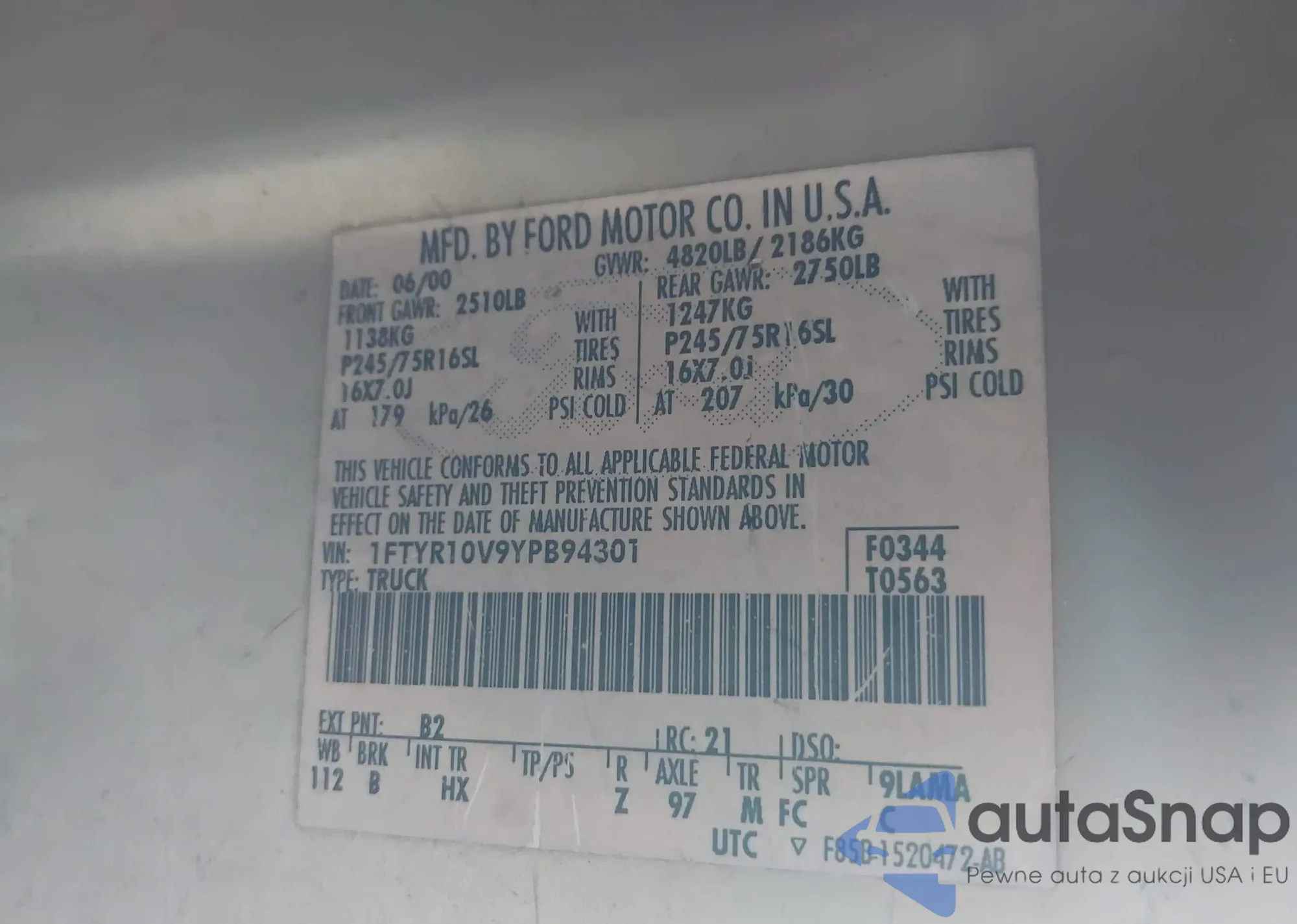 LOT: 42876430 VIN: 1FTYR10V9YPB94301