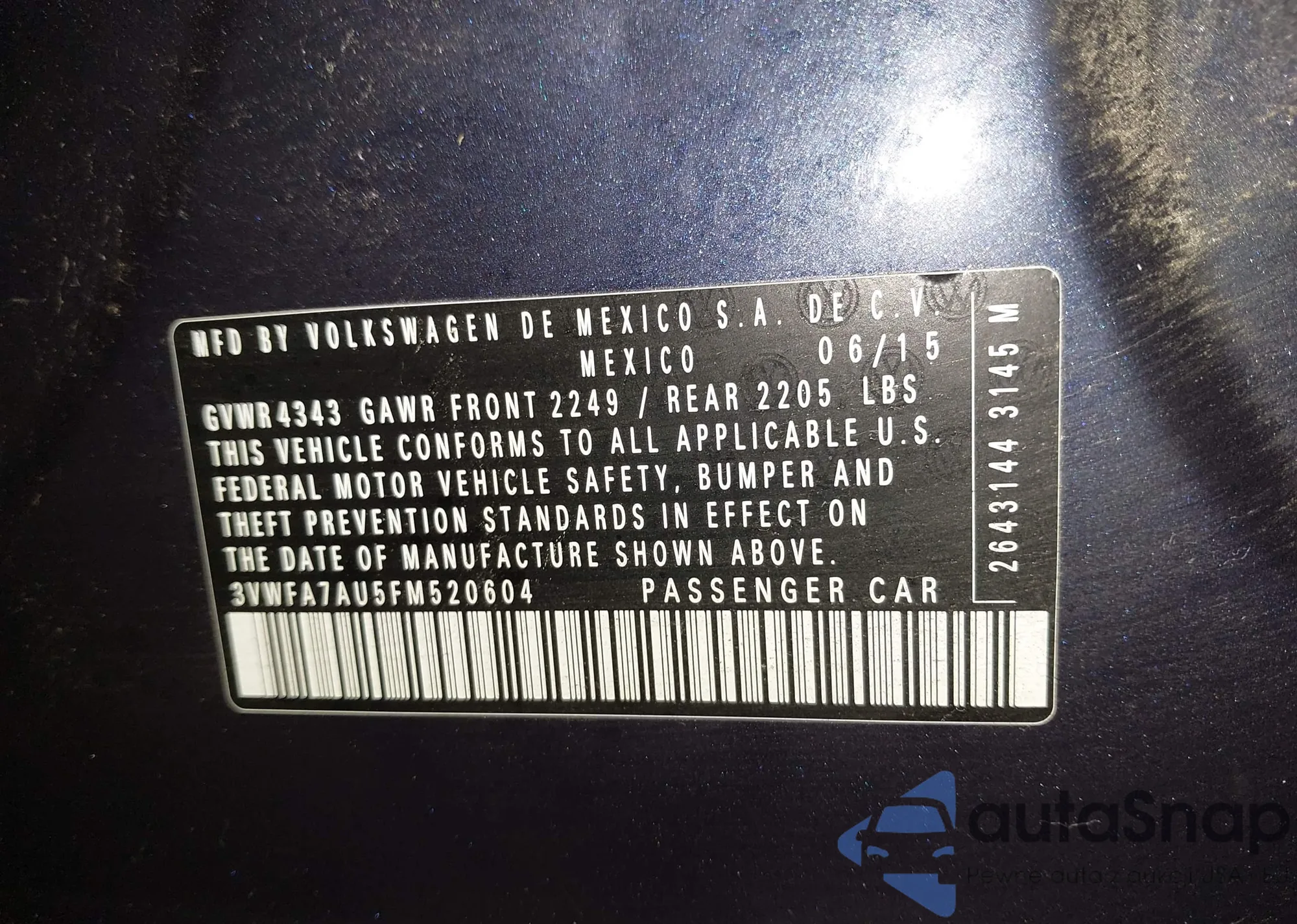 • VIN 3VWFA7AU5FM520604